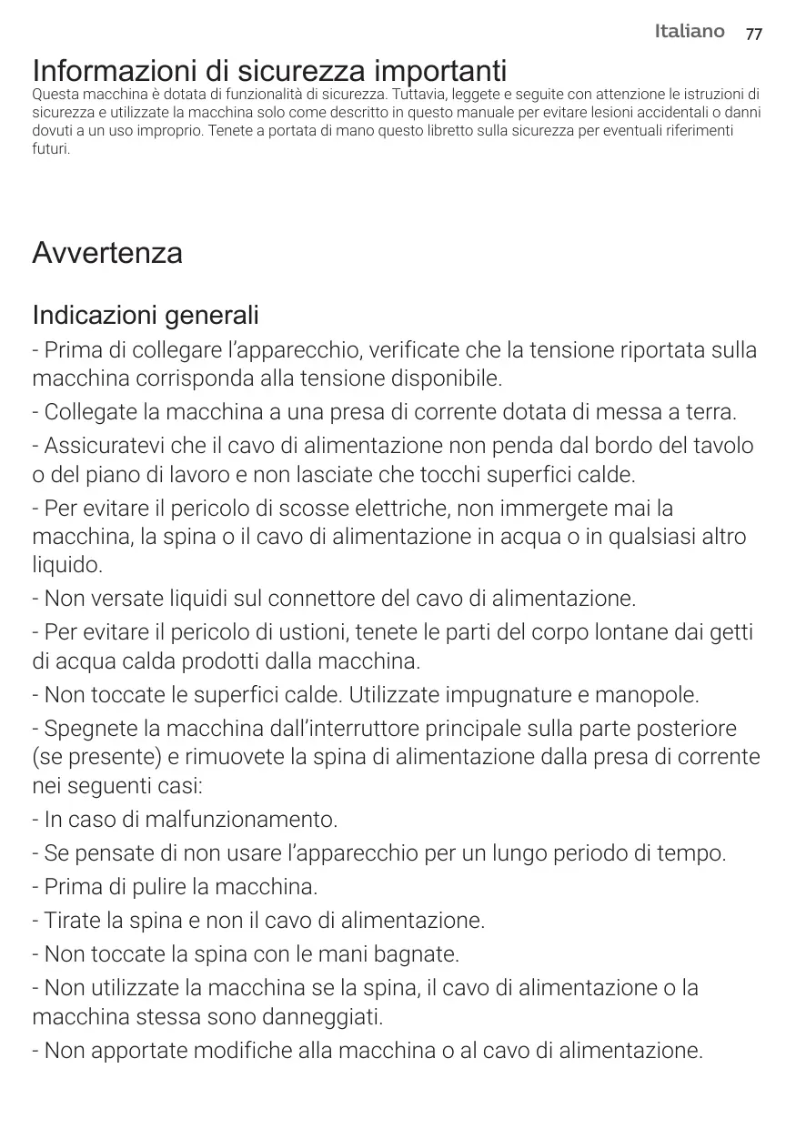 - Pour éviter le risque d’électrocution, ne plongez jamais la machine, le cordon ou le câble d’alimentation dans l’eau ou dans tout autre liquide. - Ne versez pas de liquides sur le connecteur du cordon d’alimentation. - Pour éviter le risque de brûlure, évitez tout contact avec les jets d’eau chaude émis par l’appareil. - Évitez de toucher les surfaces chaudes. Utilisez les poignées et boutons. - Éteignez la machine au moyen de l’interrupteur principal situé à l’arrière (le cas échéant) et retirez le cordon d’alimentation de la prise murale : - En cas de dysfonctionnement. - Si vous ne comptez pas utiliser l’appareil pendant une période prolongée. - Avant de nettoyer la machine. - Tirez sur la prise et non sur le cordon d’alimentation. - Ne touchez pas la prise secteur avec les mains humides. - N’utilisez jamais l’appareil si la fiche, le cordon d’alimentation ou l’appareil lui-même est endommagé. - Évitez d’effectuer toute modification de la machine ou de son cordon d’alimentation.