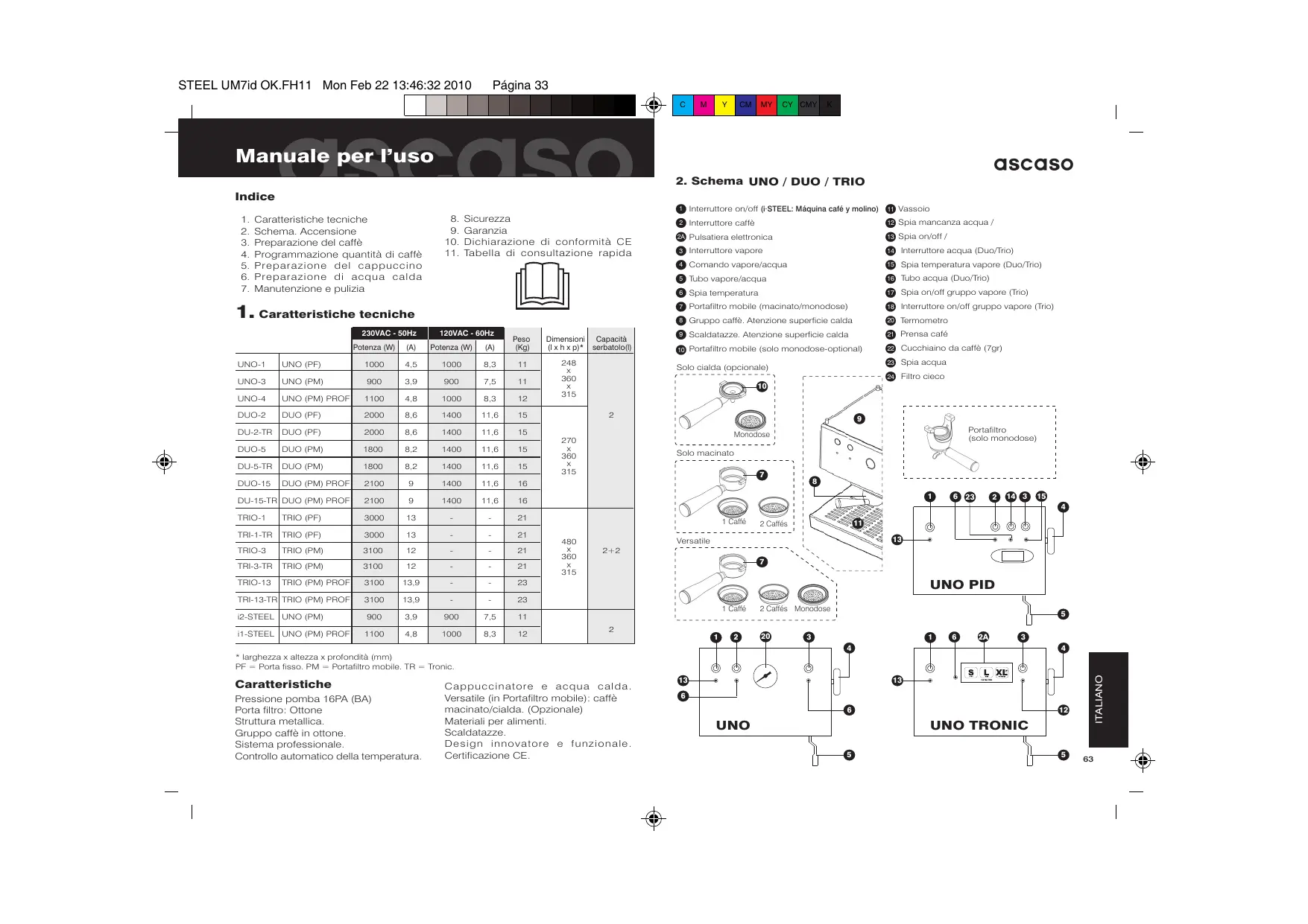 conformità CE ASCASO FACTORY SL dichiara che il prodotto cui si riferisce questa dichiarazione Macchina da caffè espresso è conforme ai requisiti della Direttiva del 14 giugno 1989 sullarmonizzazione delle leggi degli Stati membri relativamente alle macchine (89/392/CEE), materiale elettrico (73/23/CEE) e compatibilità elettromagnetica (89/396/CEE). ITALIANO Il documento di garanzia sarà lo scontrino o la fattura dacquisto. Conservatelo. Presentatelo al servizio di assistenza tecnica in caso di guasto. Questo apparecchio è garantito per le distributore a partire dalla data dacquisto contro qualsiasi difetto di fabbricazione o del materiale utilizzato. Eventuali spese di trasporto e di imballaggio saranno a carico dellutente. Questa garanzia non sarà valida nei seguenti casi: