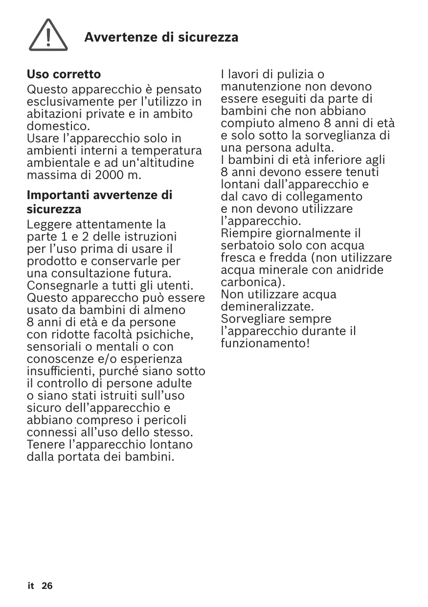 Avvertenze di sicurezza Uso corretto Questo apparecchio è pensato esclusivamente per l’utilizzo in abitazioni private e in ambito domestico. Usare l’apparecchio solo in ambienti interni a temperatura ambientale e ad un‘altitudine massima di 2000 m. Importanti avvertenze di sicurezza Leggere attentamente la parte 1 e 2 delle istruzioni per l’uso prima di usare il prodotto e conservarle per una consultazione futura. Consegnarle a tutti gli utenti. Questo appareccho può essere usato da bambini di almeno 8 anni di età e da persone con ridotte facoltà psichiche, sensoriali o mentali o con conoscenze e/o esperienza insufficienti, purché siano sotto il controllo di persone adulte o siano stati istruiti sull’uso sicuro dell’apparecchio e abbiano compreso i pericoli connessi all’uso dello stesso. Tenere l’apparecchio lontano dalla portata dei bambini.