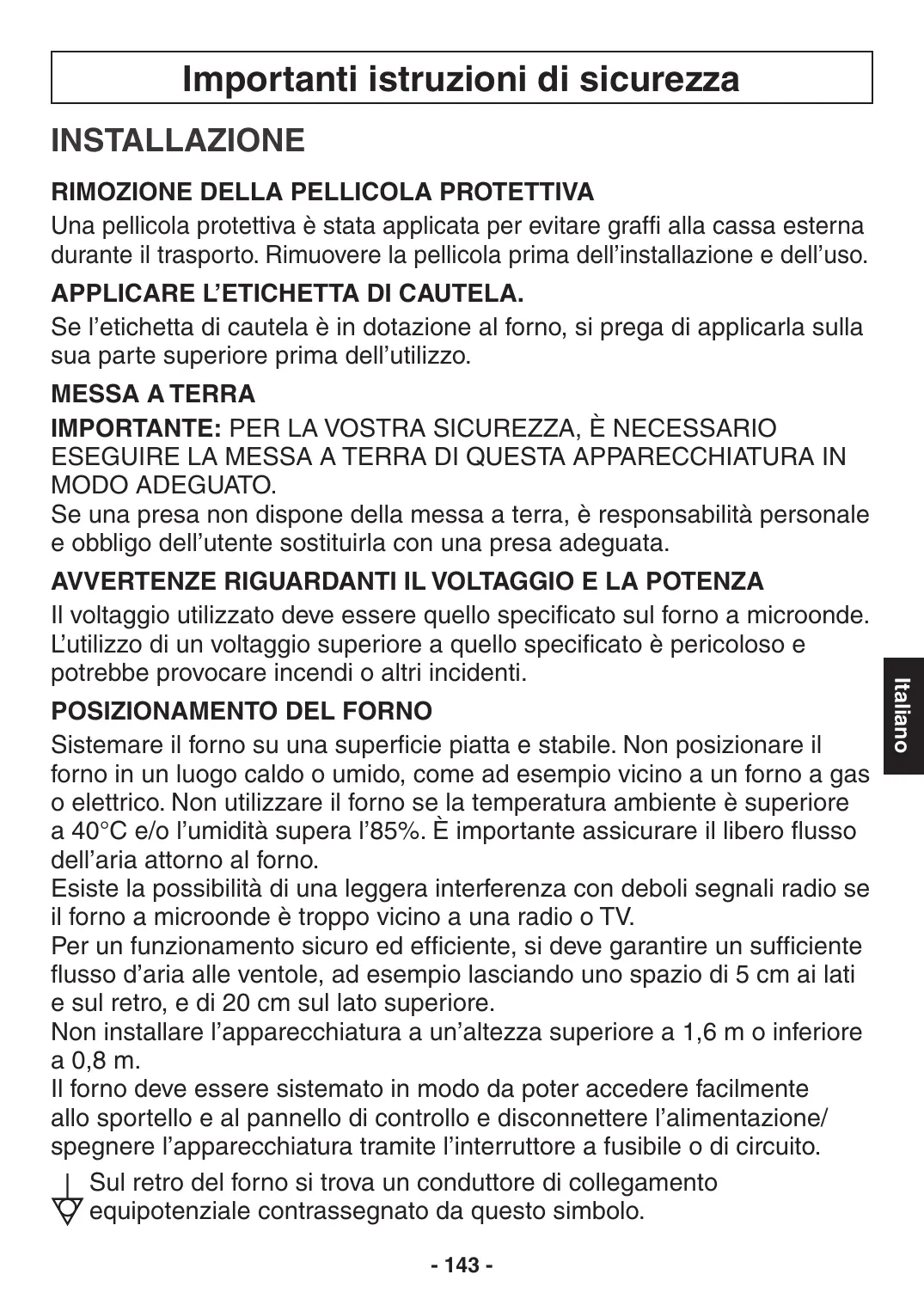 COLOCACIÓN DEL HORNO Coloque el horno sobre una superficie plana y estable. No coloque el horno en un lugar húmedo o con una temperatura elevada; por ejemplo, próximo a un campo eléctrico o de gas. No utilice el horno cuando la temperatura ambiente sea superior a 40°C y/o cuando la humedad sea superior al 85%. Es importante que el horno disponga de circulación libre de aire a su alrededor. Existe la posibilidad de que se produzcan pequeñas interferencias con señales de radiodifusión muy débiles si el horno está demasiado cerca de una radio o una televisión. Para un funcionamiento seguro y eficiente, el horno debe disponer de un flujo de aire suficiente en las salidas de aire, por ejemplo 5 cm en los laterales y en la parte posterior; 20 cm en la parte superior. No instale electrodomésticos a una altura superior a los 1,6 m ni inferior a los 0,8 m. El horno debe colocarse en un lugar que permita acceder fácilmente al panel de control y a la puerta, así como para desconectar la alimentación o desconectar la potencia mediante un fusible o un disyuntor. Se proporciona un conductor de conexión equipotencial en la parte posterior del horno y está marcado con este símbolo. - 115 -