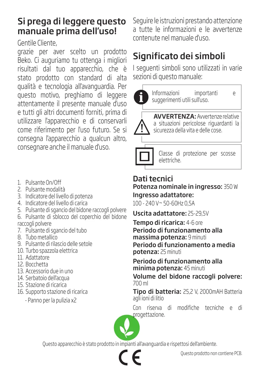 Période de fonctionnement à puissance minimum: 45 minutes Volume du bac à poussière : 700 ml Type de batterie: Batterie Li-ion 25,2 V, 2000 mAH Sous réserve de modifications techniques et de conception.