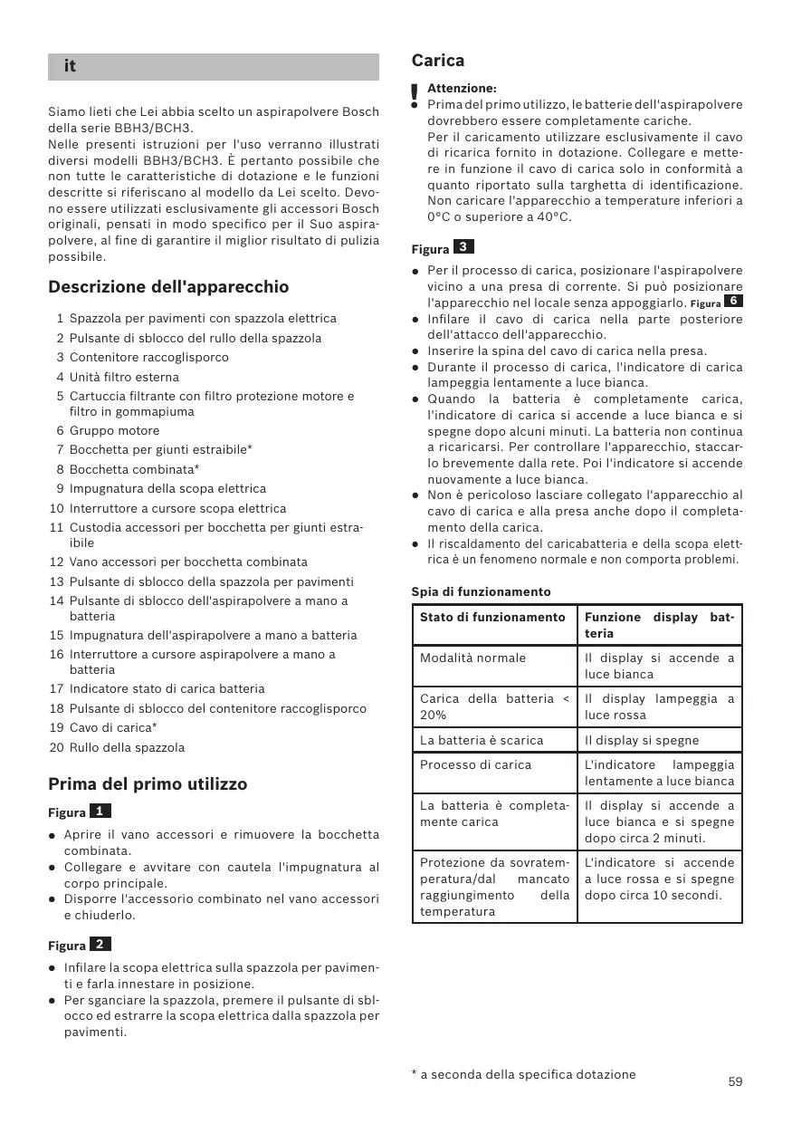 Las baterías de iones de litio incluidas cumplen con las disposiciones relativas al transporte de mercancías peligrosas. El usuario puede transportar las baterías por carretera sin necesidad de cumplir ningún requisito especial. Para el envío de las baterías a través de terceros (p. ej., transporte aéreo o mediante una empresa de transporte) deben cumplirse requisitos especiales en cuanto al embalaje y la identificación. Para ello, es necesario consultar con un experto en mercancías peligrosas antes de preparar el paquete de envío. en Congratulations on your purchase of a Bosch vacuum cleaner from the BBH3/BCH3 series. This instruction manual describes various BBH3/BCH3 models, which means that some of the equipment features and functions described may not apply to your model. You should only use original Bosch accessories, which have been specially developed for your vacuum cleaner, to achieve the best possible vacuuming results.