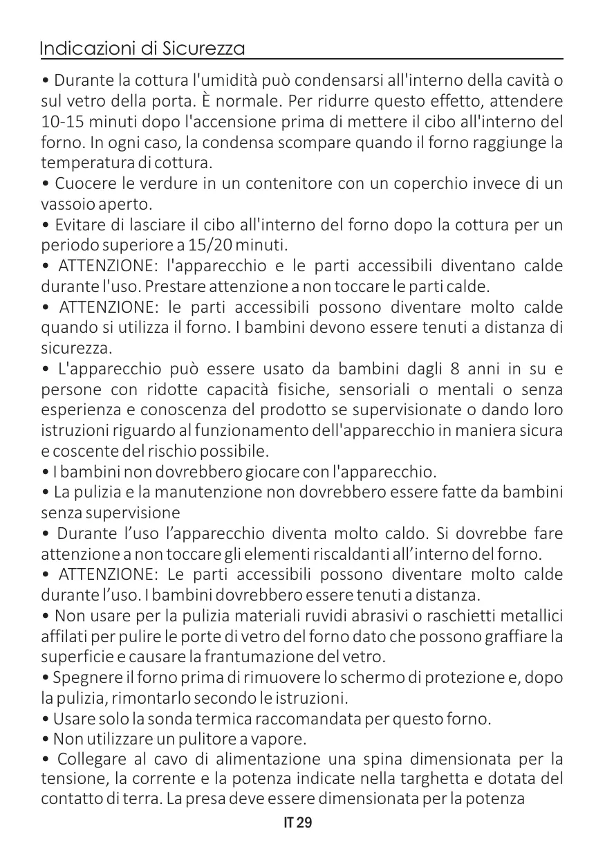Indicazioni di Sicurezza • Durante la cottura l'umidità può condensarsi all'interno della cavità o sul vetro della porta. È normale. Per ridurre questo effetto, attendere 10-15 minuti dopo l'accensione prima di mettere il cibo all'interno del forno. In ogni caso, la condensa scompare quando il forno raggiunge la temperatura di cottura. • Cuocere le verdure in un contenitore con un coperchio invece di un vassoio aperto. • Evitare di lasciare il cibo all'interno del forno dopo la cottura per un periodo superiore a 15/20 minuti. • ATTENZIONE: l'apparecchio e le parti accessibili diventano calde durante l'uso. Prestare attenzione a non toccare le parti calde. • ATTENZIONE: le parti accessibili possono diventare molto calde quando si utilizza il forno. I bambini devono essere tenuti a distanza di sicurezza. • L'apparecchio può essere usato da bambini dagli 8 anni in su e persone con ridotte capacità fisiche, sensoriali o mentali o senza esperienza e conoscenza del prodotto se supervisionate o dando loro istruzioni riguardo al funzionamento dell'apparecchio in maniera sicura e coscente del rischio possibile. • I bambini non dovrebbero giocare con l'apparecchio. • La pulizia e la manutenzione non dovrebbero essere fatte da bambini senza supervisione • Durante l’uso l’apparecchio diventa molto caldo. Si dovrebbe fare attenzione a non toccare gli elementi riscaldanti all’interno del forno. • ATTENZIONE: Le parti accessibili possono diventare molto calde durante l’uso. I bambini dovrebbero essere tenuti a distanza. • Non usare per la pulizia materiali ruvidi abrasivi o raschietti metallici affilati per pulire le porte di vetro del forno dato che possono graffiare la superficie e causare la frantumazione del vetro. • Spegnere il forno prima di rimuovere lo schermo di protezione e, dopo la pulizia, rimontarlo secondo le istruzioni. • Usare solo la sonda termica raccomandata per questo forno. • Non utilizzare un pulitore a vapore. • Collegare al cavo di alimentazione una spina dimensionata per la tensione, la corrente e la potenza indicate nella targhetta e dotata del contatto di terra. La presa deve essere dimensionata per la potenza IT 29