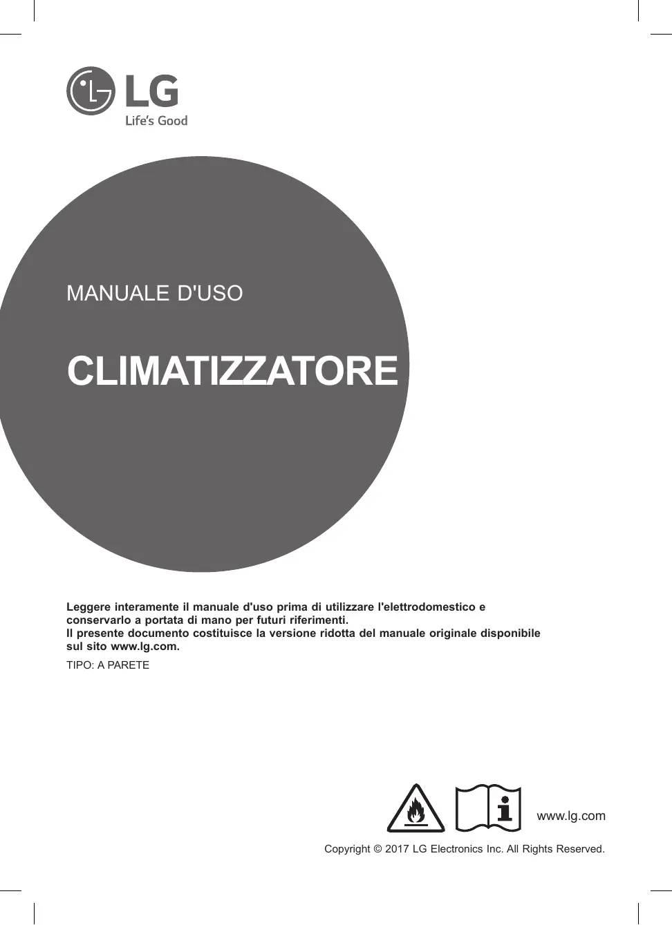MANUALE D'USO CLIMATIZZATORE Leggere interamente il manuale d'uso prima di utilizzare l'elettrodomestico e conservarlo a portata di mano per futuri riferimenti. Il presente documento costituisce la versione ridotta del manuale originale disponibile sul sito www.lg.com. TIPO: A PARETE
