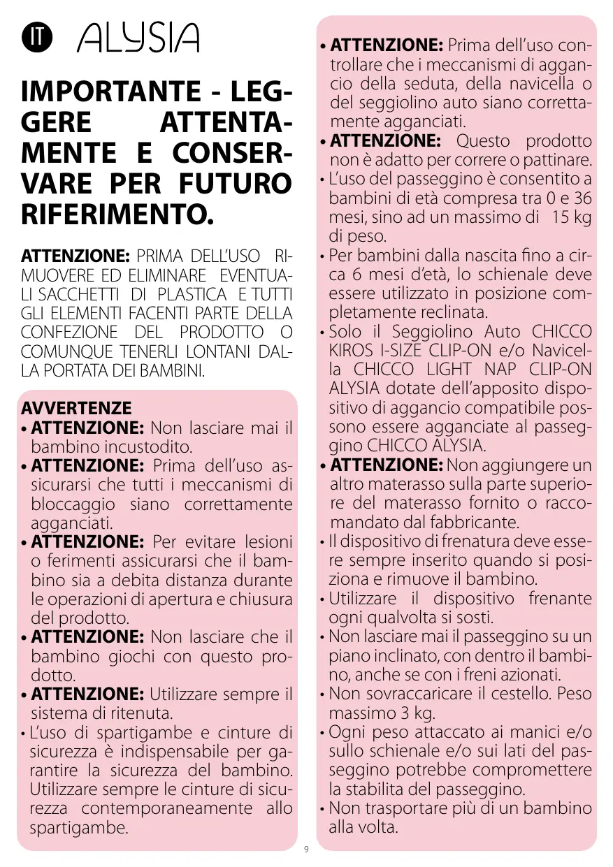 • Seul le siège-auto CHICCO KIROS I-SIZE CLIP-ON et/ou la nacelle CHICCO LIGHT NAP CLIP-ON ALYSIA équipés de dispositifs de fixation compatibles peuvent être fixés à la poussette CHICCO ALYSIA. • AVERTISSEMENT : Ne pas superposer un autre matelas sur le matelas fourni ou recommandé par le fabricant. • Le système de freinage doit être actionné avant de positionner ou de retirer l’enfant. • Utiliser le dispositif de freinage chaque fois que la poussette est à l’arrêt. • Ne jamais laisser la poussette sur un plan incliné avec l’enfant à l’intérieur, même avec le frein actionné. • Ne pas mettre dans le panier de poids supérieur à 3 kg. • Tout poids suspendu aux poignées et/ou au dossier et/ou sur les côtés de la poussette pourrait compromettre sa stabilité. • Ne pas transporter plus d’un enfant à la fois. • Ne pas monter sur la poussette d’accessoires, pièces de rechange ou composants non fournis ou non approuvés par le constructeur. • Ne pas utiliser la poussette si des