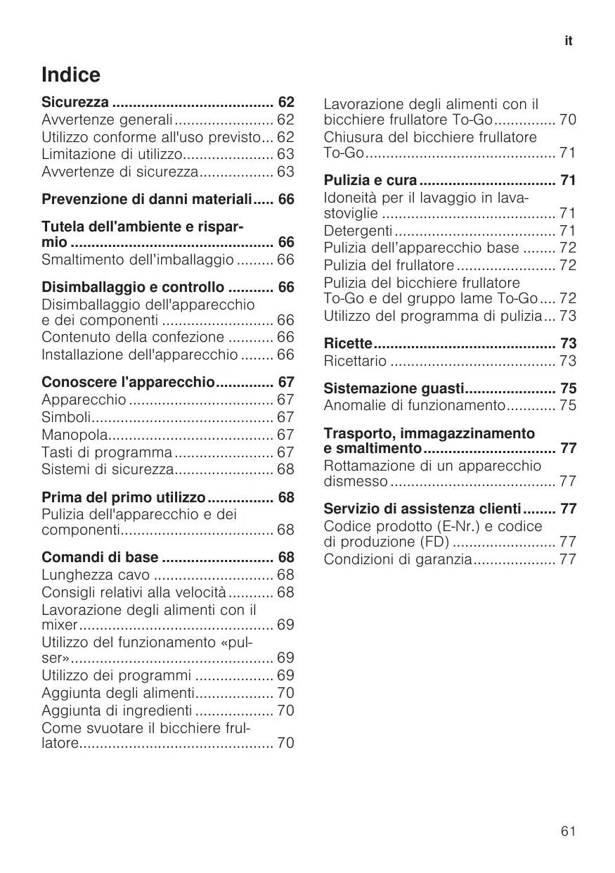 If you contact Customer Service, you will require the product number (ENr.) and the production number (FD) of your appliance. The contact details for Customer Service can be found in the Customer Élimination de l'emballage 47 Déballer et contrôler 47 Déballer l’appareil et ses composants 47 Contenu de la livraison 47 Installer l’appareil 47 Description de l'appareil 48 Appareil 48 Symboles 48 Nettoyer l'appareil et les pièces 49 Utilisation de base 49 Longueur du cordon 49 Recommandations de vitesse 49 Transformer les aliments avec le blender 50 Utiliser le fonctionnement momentané 50 Utiliser les programmes 50 Faire descendre des aliments 51 Rajouter des ingrédients 51 Vider le bol blender 51 Transformer les aliments avec la gourde 51 Fermer la gourde 52