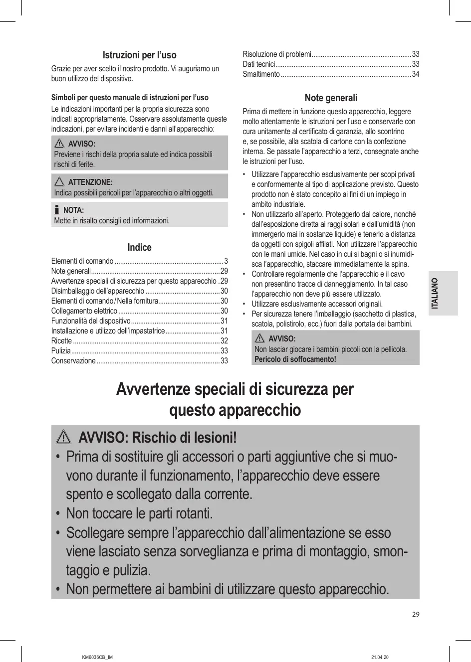 AVVISO: Rischio di lesioni! Prima di sostituire gli accessori o parti aggiuntive che si muovono durante il funzionamento, l’apparecchio deve essere spento e scollegato dalla corrente. Non toccare le parti rotanti. Scollegare sempre l’apparecchio dall’alimentazione se esso viene lasciato senza sorveglianza e prima di montaggio, smontaggio e pulizia. Non permettere ai bambini di utilizzare questo apparecchio.