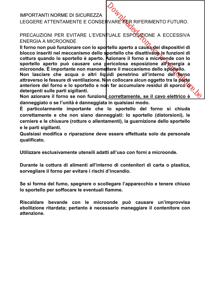 PRECAUZIONI PER EVITARE L’EVENTUALE ESPOSIZIONE A ECCESSIVA ENERGIA A MICROONDE Il forno non può funzionare con lo sportello aperto a causa dei dispositivi di blocco inseriti nel meccanismo dello sportello che disattivano le funzioni di cottura quando lo sportello è aperto. Azionare il forno a microonde con lo sportello aperto può causare una pericolosa esposizione all’energia a microonde. È importante non manomettere il meccanismo dello sportello. Non lasciare che acqua o altri liquidi penetrino all’interno del forno attraverso le fessure di ventilazione. Non collocare alcun oggetto tra la parte anteriore del forno e lo sportello e non far accumulare residui di sporco o detergenti sulle parti sigillanti. Non azionare il forno se non funziona correttamente, se il cavo elettrico è danneggiato o se l’unità è danneggiata in qualsiasi modo. È particolarmente importante che lo sportello del forno si chiuda correttamente e che non siano danneggiati: lo sportello (distorsioni), le cerniere e le chiusure (rotture o allentamenti), la guarnizione dello sportello e le parti sigillanti. Qualsiasi modifica o riparazione deve essere effettuata solo da personale qualificato.
