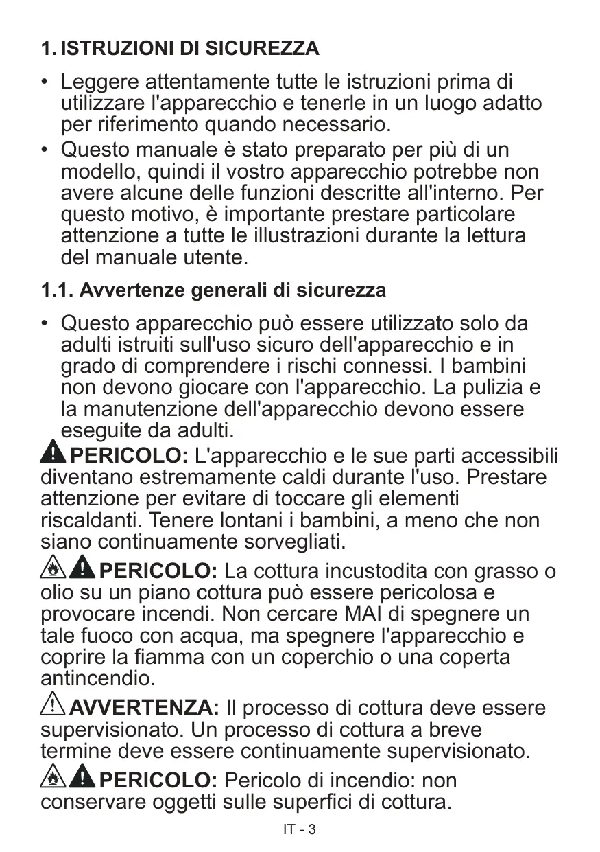 Questo manuale utente contiene importanti informazioni sulla sicurezza e istruzioni sul funzionamento e la manutenzione del vostro apparecchio. Prima di utilizzare quest’ultimo, si prega di leggere attentamente questo manuale utente e di conservarlo per future consultazioni. • En las encimeras de inducción, apague el elemento que esté calentando tras su uso con el mando de control. No se fíe del detector de recipiente. • En los modelos que incorporan una tapa de encimera, limpie los alimentos que se hayan derramado sobre la tapa antes de usarla y deje que se enfríe la cocina antes de cerrar la tapa. • No use el aparato con un temporizador externo o un sistema de control remoto aparte. ADVERTENCIA: Para evitar que el aparato se vuelque, deben instalarse los soportes estabilizadores. (Si desea obtener información detallada, consulte la guía del kit antivuelco). • Durante el uso, el aparato se calentará. Se debe tener cuidado a fin de evitar tocar los elementos de calentamiento que hay dentro del horno. • Durante el uso, los tiradores se pueden calentar en un corto período de tiempo. • No use productos de limpieza abrasivos agresivos ES - 4