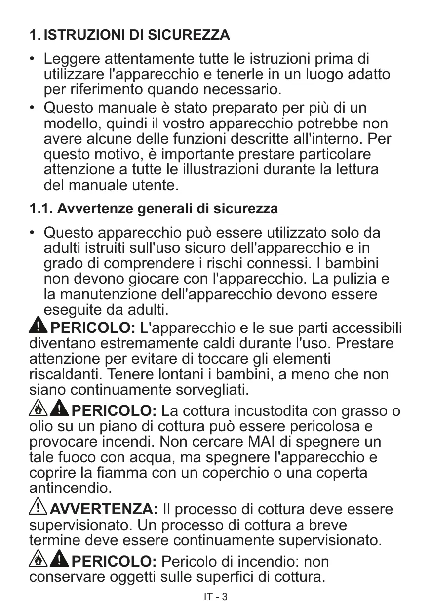 Questo apparecchio può essere utilizzato solo da adulti istruiti sull'uso sicuro dell'apparecchio e in grado di comprendere i rischi connessi. I bambini non devono giocare con l'apparecchio. La pulizia e la manutenzione dell'apparecchio devono essere eseguite da adulti. PERICOLO: L'apparecchio e le sue parti accessibili diventano estremamente caldi durante l'uso. Prestare attenzione per evitare di toccare gli elementi riscaldanti. Tenere lontani i bambini, a meno che non siano continuamente sorvegliati. PERICOLO: La cottura incustodita con grasso o olio su un piano di cottura può essere pericolosa e provocare incendi. Non cercare MAI di spegnere un tale fuoco con acqua, ma spegnere l'apparecchio e coprire la fiamma con un coperchio o una coperta antincendio. AVVERTENZA: Il processo di cottura deve essere supervisionato. Un processo di cottura a breve termine deve essere continuamente supervisionato. PERICOLO: Pericolo di incendio: non conservare oggetti sulle superfici di cottura. IT - 3