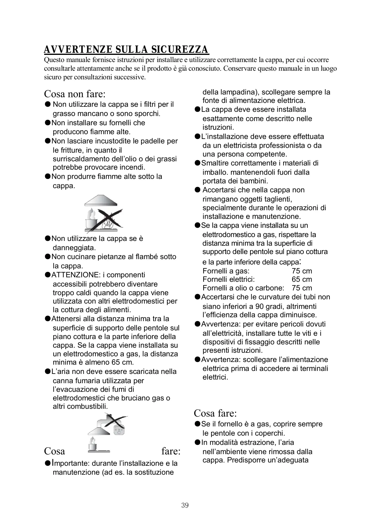 ●Les réglementations relatives à l’évacuation de l’air doivent être respectées. ●Nettoyez régulièrement votre appareil en suivant la méthode fournie dans le chapitre ENTRETIEN. ●Pour des raisons de sécurité, veuillez n’utiliser que des vis de fixation ou de montage de la même taille que celle recommandée dans ce manuel d’instruction. ●En ce qui concerne les détails sur la méthode et la fréquence de nettoyage, veuillez vous reporter au paragraphe relatif à l’entretien et au nettoyage dans le manuel d’instruction. ●Le nettoyage et l’entretien ne doivent pas être effectués par des enfants sans surveillance. ●Quand la hotte aspirante et les appareils alimentés par autre chose que de l’électricité fonctionnent simultanément, la pression négative à l’intérieur de la pièce ne doit pas dépasser 4 Pa (4 x 10-5 bar). ●AVERTISSEMENT : Risque d’incendie : ne rangez pas des objets sur les surfaces de cuisson. ●Il ne faut pas utiliser de nettoyeur vapeur. ●Ne tentez JAMAIS d’éteindre un incendie avec de l’eau, mais éteignez l’appareil puis couvrez la flamme par exemple avec un couvercle ou une couverture pareflammes.