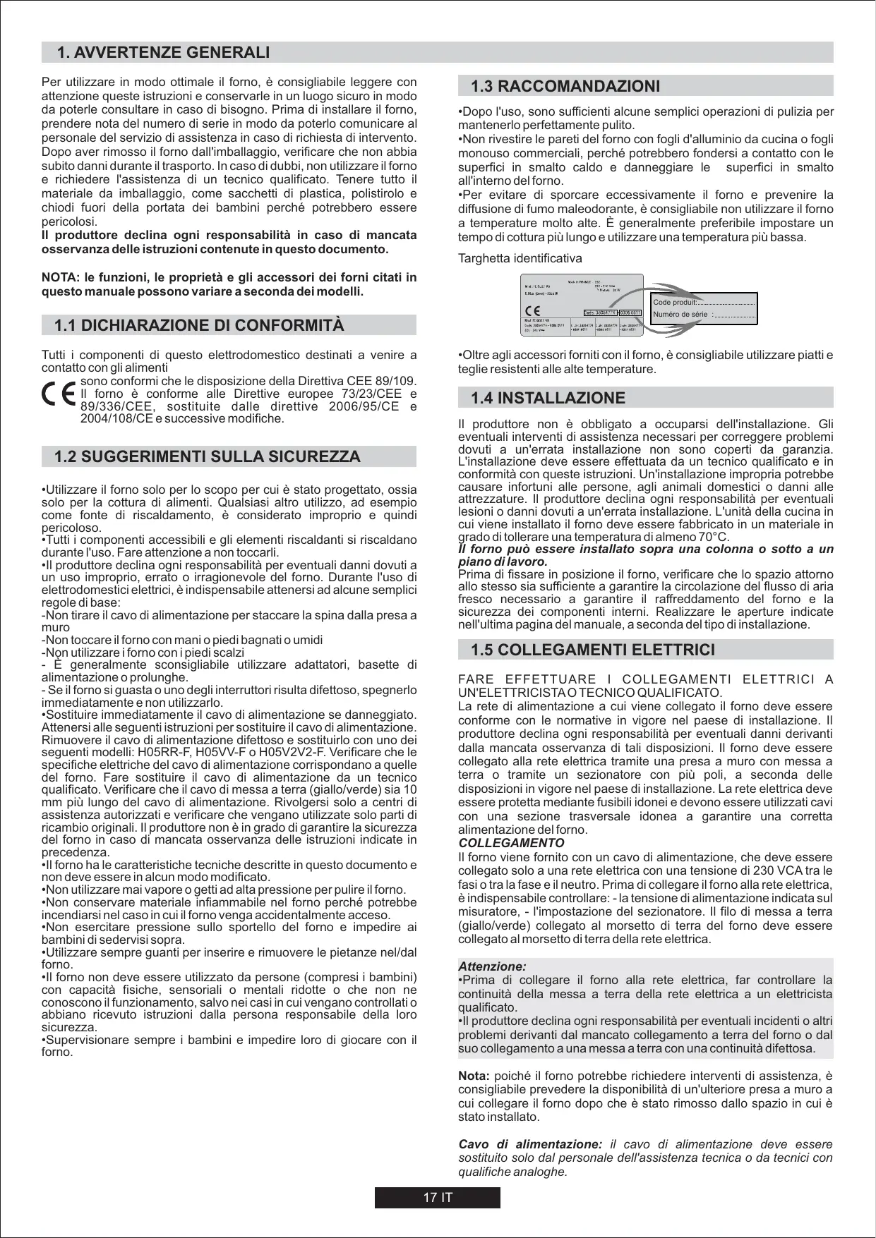 1.1 DICHIARAZIONE DI CONFORMITÀ Tutti i componenti di questo elettrodomestico destinati a venire a contatto con gli alimenti sono conformi che le disposizione della Direttiva CEE 89/109. Il forno è conforme alle Direttive europee 73/23/CEE e 89/336/CEE, sostituite dalle direttive 2006/95/CE e 2004/108/CE e successive modifiche.