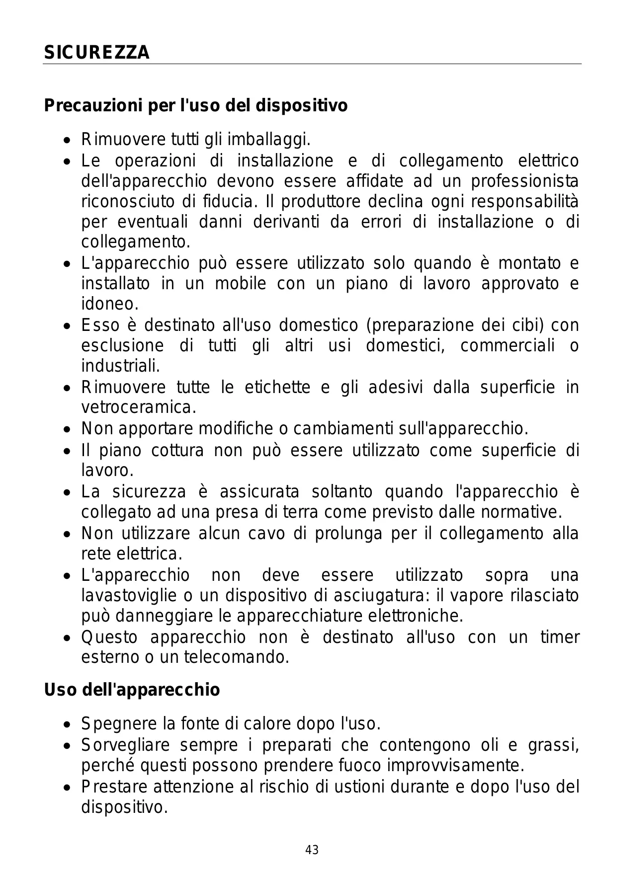 SICUREZZA Precauzioni per l'uso del dispositivo • Rimuovere tutti gli imballaggi. • Le operazioni di installazione e di collegamento elettrico dell'apparecchio devono essere affidate ad un professionista riconosciuto di fiducia. Il produttore declina ogni responsabilità per eventuali danni derivanti da errori di installazione o di collegamento. • L'apparecchio può essere utilizzato solo quando è montato e installato in un mobile con un piano di lavoro approvato e idoneo. • Esso è destinato all'uso domestico (preparazione dei cibi) con esclusione di tutti gli altri usi domestici, commerciali o industriali. • Rimuovere tutte le etichette e gli adesivi dalla superficie in vetroceramica. • Non apportare modifiche o cambiamenti sull'apparecchio. • Il piano cottura non può essere utilizzato come superficie di lavoro. • La sicurezza è assicurata soltanto quando l'apparecchio è collegato ad una presa di terra come previsto dalle normative. • Non utilizzare alcun cavo di prolunga per il collegamento alla rete elettrica. • L'apparecchio non deve essere utilizzato sopra una lavastoviglie o un dispositivo di asciugatura: il vapore rilasciato può danneggiare le apparecchiature elettroniche. • Questo apparecchio non è destinato all'uso con un timer esterno o un telecomando. Uso dell'apparecchio • Spegnere la fonte di calore dopo l'uso. • Sorvegliare sempre i preparati che contengono oli e grassi, perché questi possono prendere fuoco improvvisamente. • Prestare attenzione al rischio di ustioni durante e dopo l'uso del dispositivo. 43