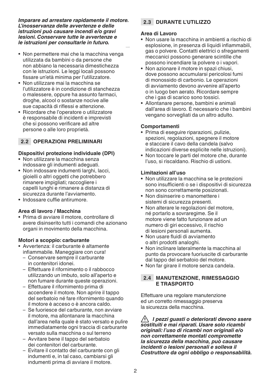 Questa macchina è un motore a scoppio. Il motore è un’apparecchiatura le cui prestazioni, regolarità di funzionamento e durata sono condizionati da molti fattori, alcuni esterni ed altri strettamente correlati alla qualità dei prodotti impiegati e alla regolarità della manutenzione. Qui di seguito sono riportate alcune informazioni aggiuntive che permettono un utilizzo più consapevole della vostra macchina. Qualsiasi altro impiego, difforme da quelli sopra citati, può rivelarsi pericoloso e causare danni a persone e/o cose. Rimessaggio
