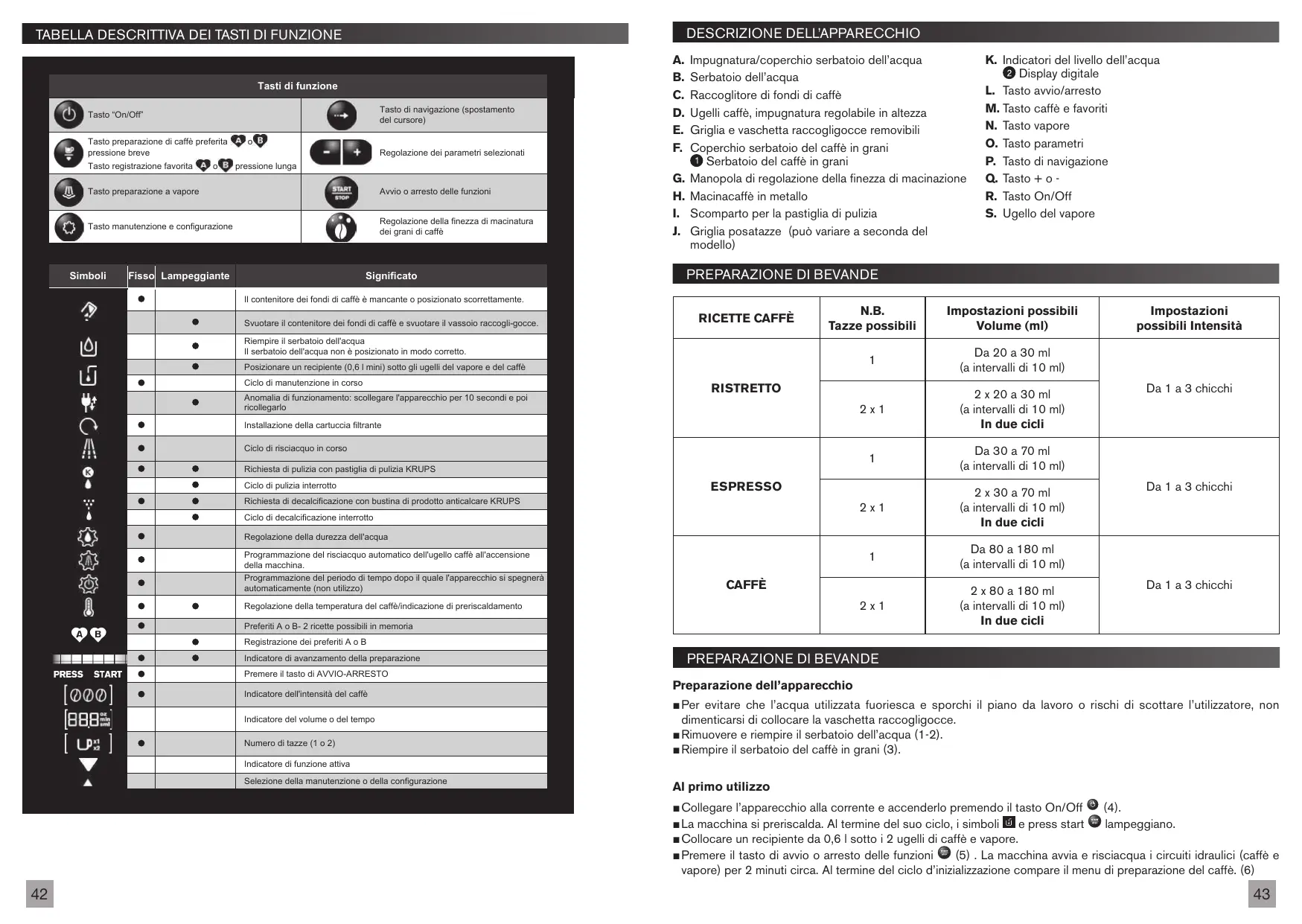 Da 80 a 180 ml (a intervalli di 10 ml) 2x1 2 x 80 a 180 ml (a intervalli di 10 ml) In due cicli Riempire il serbatoio dell'acqua Il serbatoio dell'acqua non è posizionato in modo corretto. Posizionare un recipiente (0,6 l mini) sotto gli ugelli del vapore e del caffè Ciclo di manutenzione in corso Anomalia di funzionamento: scollegare l'apparecchio per 10 secondi e poi ricollegarlo RISTRETTO Installazione della cartuccia filtrante Ciclo di risciacquo in corso Richiesta di pulizia con pastiglia di pulizia KRUPS Ciclo di pulizia interrotto ESPRESSO Richiesta di decalcificazione con bustina di prodotto anticalcare KRUPS Ciclo di decalcificazione interrotto Regolazione della durezza dell'acqua Programmazione del risciacquo automatico dell'ugello caffè all'accensione della macchina. Programmazione del periodo di tempo dopo il quale l'apparecchio si spegnerà automaticamente (non utilizzo) K. Indicatori del livello dell’acqua Display digitale L. Tasto avvio/arresto M. Tasto caffè e favoriti N. Tasto vapore O. Tasto parametri P. Tasto di navigazione Q. Tasto + o R. Tasto On/Off S. Ugello del vapore CAFFÈ Regolazione della temperatura del caffè/indicazione di preriscaldamento Preferiti A o B- 2 ricette possibili in memoria Impostazioni possibili Intensità Da 1 a 3 chicchi Da 1 a 3 chicchi Da 1 a 3 chicchi Registrazione dei preferiti A o B Indicatore di avanzamento della preparazione Premere il tasto di AVVIO-ARRESTO Indicatore dell'intensità del caffè Indicatore del volume o del tempo Numero di tazze (1 o 2) Indicatore di funzione attiva Selezione della manutenzione o della configurazione