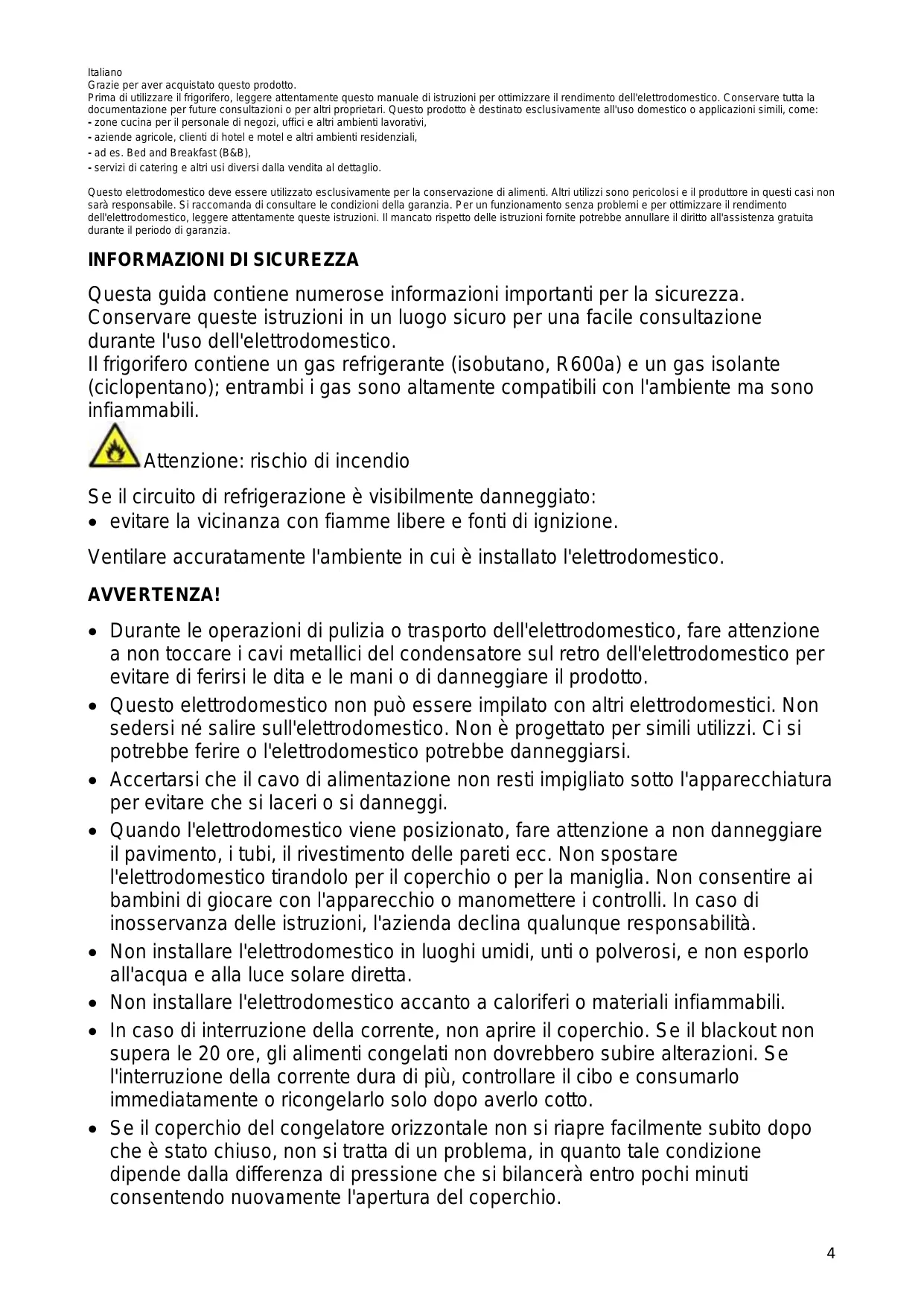 Qesto eletrodomestico devesse esuizato esusivamente per la conservazione di alimenti. Altri utilzi sono pericolosi e i produttore in quosti cas non sara responsabile. Si raccomanda di consulare le condizioni della garanzia. Per un funzionamento sanza problemi e per optimizzare il rendimento dell'eletrodomestico, leggere attendente queste istruzioni. Il mancato rispetto delle istruzioni fornite potrebbe annullare il diritto all'assistenza gratuite durante il periodo di garanzia.