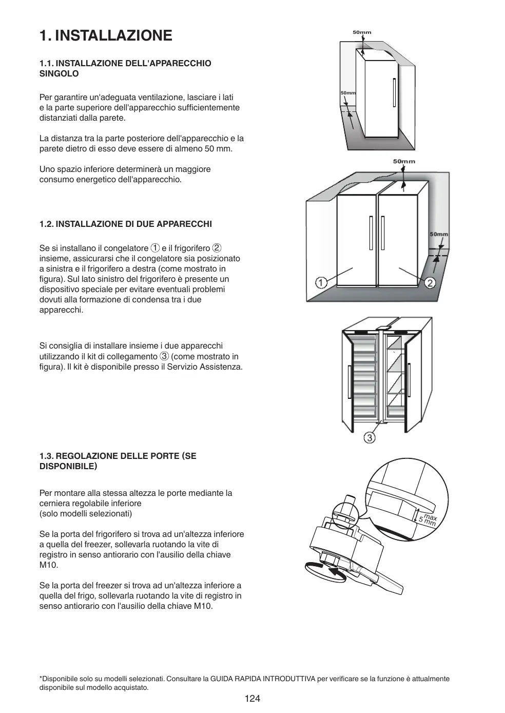 1.2. INSTALLAZIONE DI DUE APPARECCHI Se si installano il congelatore 1 e il frigorifero 2 insieme, assicurarsi che il congelatore sia posizionato a sinistra e il frigorifero a destra (come mostrato in figura). Sul lato sinistro del frigorifero è presente un dispositivo speciale per evitare eventuali problemi dovuti alla formazione di condensa tra i due apparecchi. Si consiglia di installare insieme i due apparecchi utilizzando il kit di collegamento 3 (come mostrato in figura). Il kit è disponibile presso il Servizio Assistenza.