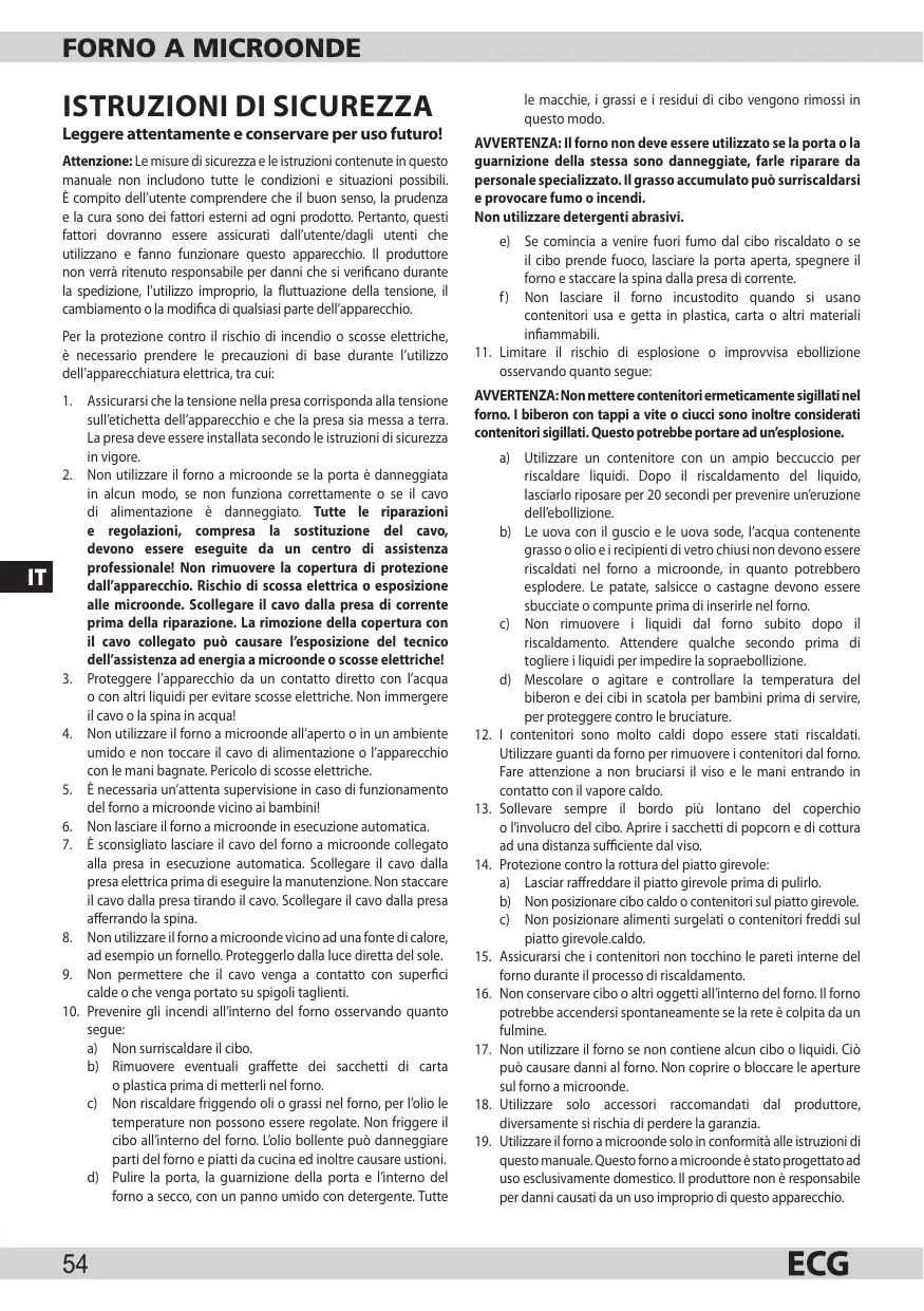 a) Utilizzare un contenitore con un ampio beccuccio per riscaldare liquidi. Dopo il riscaldamento del liquido, lasciarlo riposare per 20 secondi per prevenire un’eruzione dell’ebollizione. b) Le uova con il guscio e le uova sode, l’acqua contenente grasso o olio e i recipienti di vetro chiusi non devono essere riscaldati nel forno a microonde, in quanto potrebbero esplodere. Le patate, salsicce o castagne devono essere sbucciate o compunte prima di inserirle nel forno. c) Non rimuovere i liquidi dal forno subito dopo il riscaldamento. Attendere qualche secondo prima di togliere i liquidi per impedire la sopraebollizione. d) Mescolare o agitare e controllare la temperatura del biberon e dei cibi in scatola per bambini prima di servire, per proteggere contro le bruciature. I contenitori sono molto caldi dopo essere stati riscaldati. Utilizzare guanti da forno per rimuovere i contenitori dal forno. Fare attenzione a non bruciarsi il viso e le mani entrando in contatto con il vapore caldo. Sollevare sempre il bordo più lontano del coperchio o l’involucro del cibo. Aprire i sacchetti di popcorn e di cottura ad una distanza sufficiente dal viso. Protezione contro la rottura del piatto girevole: a) Lasciar raffreddare il piatto girevole prima di pulirlo. b) Non posizionare cibo caldo o contenitori sul piatto girevole. c) Non posizionare alimenti surgelati o contenitori freddi sul piatto girevole.caldo. Assicurarsi che i contenitori non tocchino le pareti interne del forno durante il processo di riscaldamento. Non conservare cibo o altri oggetti all’interno del forno. Il forno potrebbe accendersi spontaneamente se la rete è colpita da un fulmine. Non utilizzare il forno se non contiene alcun cibo o liquidi. Ciò può causare danni al forno. Non coprire o bloccare le aperture sul forno a microonde. Utilizzare solo accessori raccomandati dal produttore, diversamente si rischia di perdere la garanzia. Utilizzare il forno a microonde solo in conformità alle istruzioni di questo manuale. Questo forno a microonde è stato progettato ad uso esclusivamente domestico. Il produttore non è responsabile per danni causati da un uso improprio di questo apparecchio.