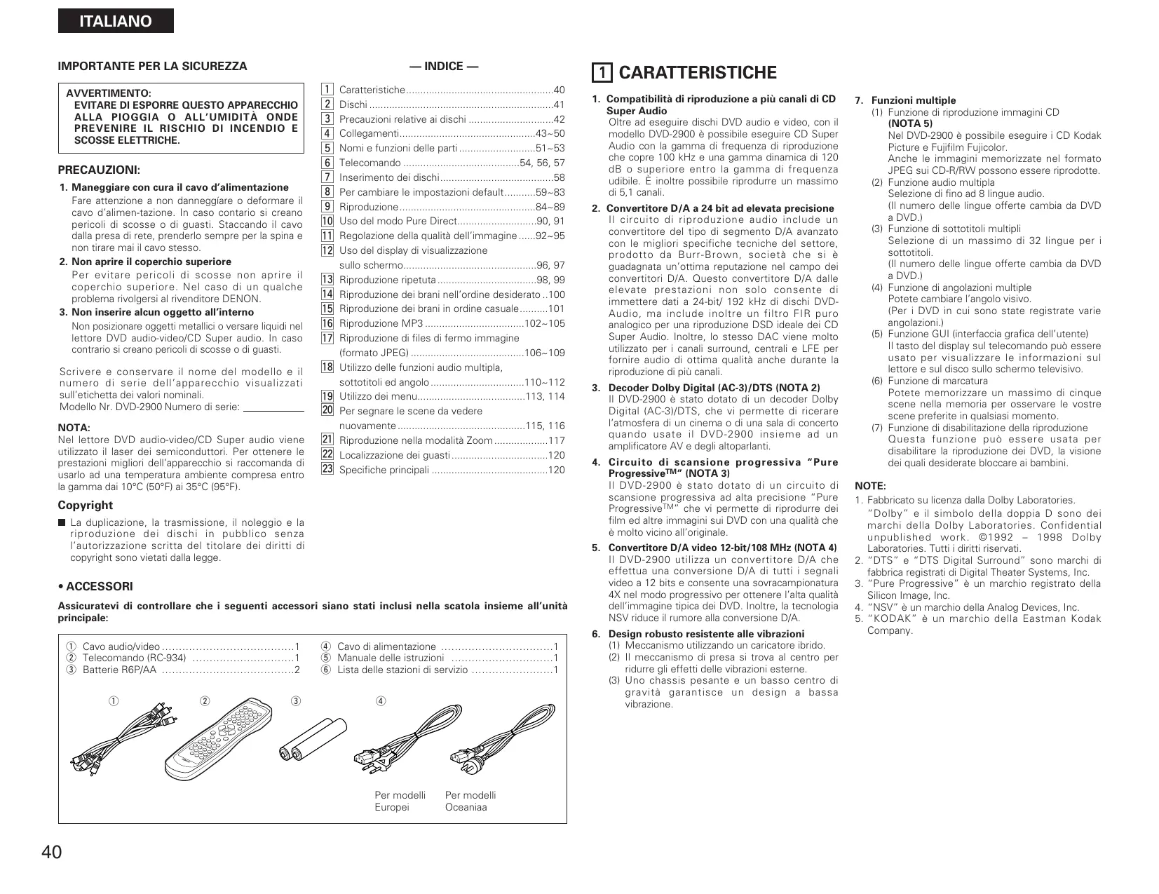 PRECAUZIONI: 1. Maneggiare con cura il cavo d’alimentazione Fare attenzione a non danneggíare o deformare il cavo d’alimen-tazione. In caso contario si creano pericoli di scosse o di guasti. Staccando il cavo dalla presa di rete, prenderlo sempre per la spina e non tirare mai il cavo stesso. 2. Non aprire il coperchio superiore Per evitare pericoli di scosse non aprire il coperchio superiore. Nel caso di un qualche problema rivolgersi al rivenditore DENON. 3. Non inserire alcun oggetto all’interno Non posizionare oggetti metallici o versare liquidi nel lettore DVD audio-video/CD Super audio. In caso contrario si creano pericoli di scosse o di guasti. Scrivere e conservare il nome del modello e il numero di serie dell’apparecchio visualizzati sull’etichetta dei valori nominali. Modello Nr. DVD-2900 Numero di serie: NOTA: Nel lettore DVD audio-video/CD Super audio viene utilizzato il laser dei semiconduttori. Per ottenere le prestazioni migliori dell’apparecchio si raccomanda di usarlo ad una temperatura ambiente compresa entro la gamma dai 10°C (50°F) ai 35°C (95°F).