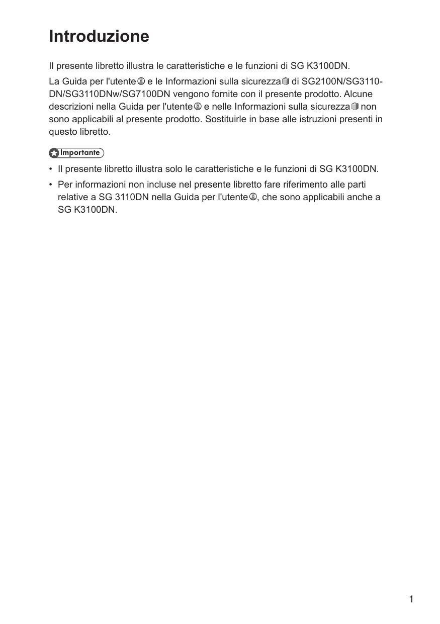 Introduzione Il presente libretto illustra le caratteristiche e le funzioni di SG K3100DN. La Guida per l'utente e le Informazioni sulla sicurezza di SG2100N/SG3110DN/SG3110DNw/SG7100DN vengono fornite con il presente prodotto. Alcune descrizioni nella Guida per l'utente e nelle Informazioni sulla sicurezza non sono applicabili al presente prodotto. Sostituirle in base alle istruzioni presenti in questo libretto.