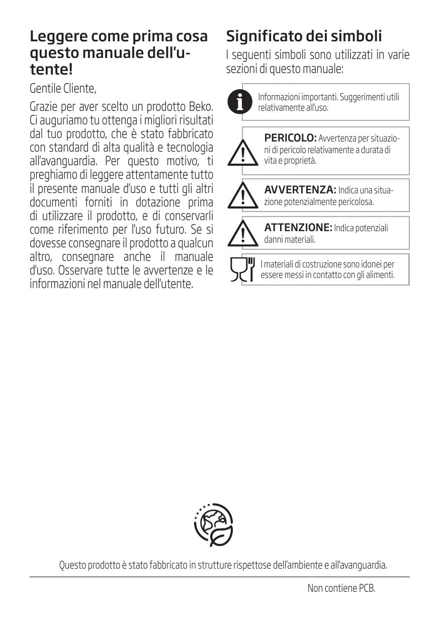 Leggere come prima cosa questo manuale dell'utente! Gentile Cliente, Grazie per aver scelto un prodotto Beko. Ci auguriamo tu ottenga i migliori risultati dal tuo prodotto, che è stato fabbricato con standard di alta qualità e tecnologia all'avanguardia. Per questo motivo, ti preghiamo di leggere attentamente tutto il presente manuale d'uso e tutti gli altri documenti forniti in dotazione prima di utilizzare il prodotto, e di conservarli come riferimento per l'uso futuro. Se si dovesse consegnare il prodotto a qualcun altro, consegnare anche il manuale d'uso. Osservare tutte le avvertenze e le informazioni nel manuale dell'utente.