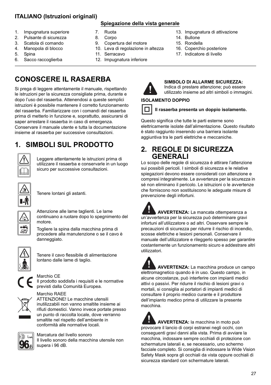 14. Le niveau sonore de votre outil ne dépasse pas 96 dB. SYMBOLE D’ALERTE DE SÉCURITÉ : Indique qu’une précaution ou une mise en garde peut être utilisée avec d’autres symboles ou images. DOUBLE ISOLATION Votre tondeuse est doublement isolée. Cela signifie que toutes les parties externes sont isolées électriquement de l’alimentation. Pour cela, une barrière d’isolation supplémentaire est placée entre les parties électriques et mécaniques.