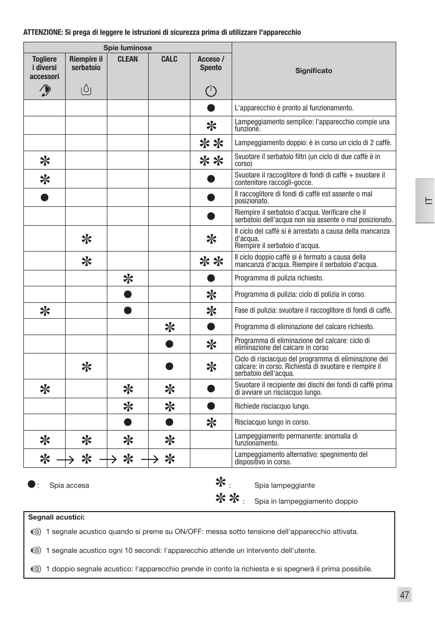 Vider le collecteur de marc (un cycle de 2 cafés est en cours). Vider le collecteur de marc + vider le bac récoltegouttes. Le collecteur de marc est absent ou mal positionné. Remplir le réservoir d'eau. Le réservoir d'eau est absent ou mal positionné. Le cycle café a été interrompu par manque d'eau. Remplir le réservoir d'eau. Le cycle double café a été interrompu par manque d'eau. Remplir le réservoir. Programme de nettoyage demandé. Programme de nettoyage : cycle de nettoyage en cours. Phase de nettoyage : vider le bac à marc. Programme de détartrage demandé. Programme de détartrage : cycle de détartrage en cours. Cycles de rinçage du programme de détartrage : en cours. Demande de vider et de remplir le réservoir d'eau. Vider le bac à cake avant le lancement d'un rinçage long. Demande rinçage long. Rinçage long en cours. Clignotement Simultané : anomalie de fonctionnement. Clignotement voyant après voyant : mise en hors tension de l'appareil en cours. :