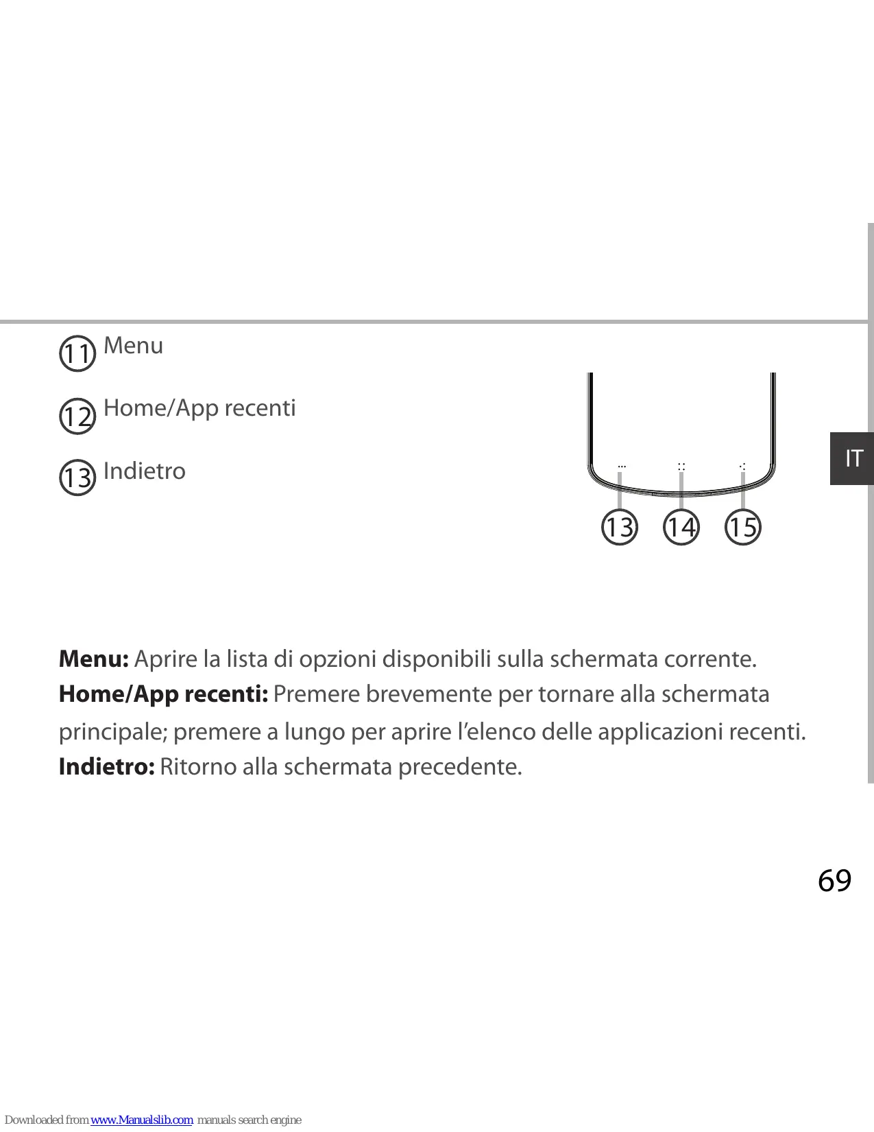 Menu: Aprire la lista di opzioni disponibili sulla schermata corrente. Home/App recenti: Premere brevemente per tornare alla schermata principale; premere a lungo per aprire l’elenco delle applicazioni recenti. Indietro: Ritorno alla schermata precedente.