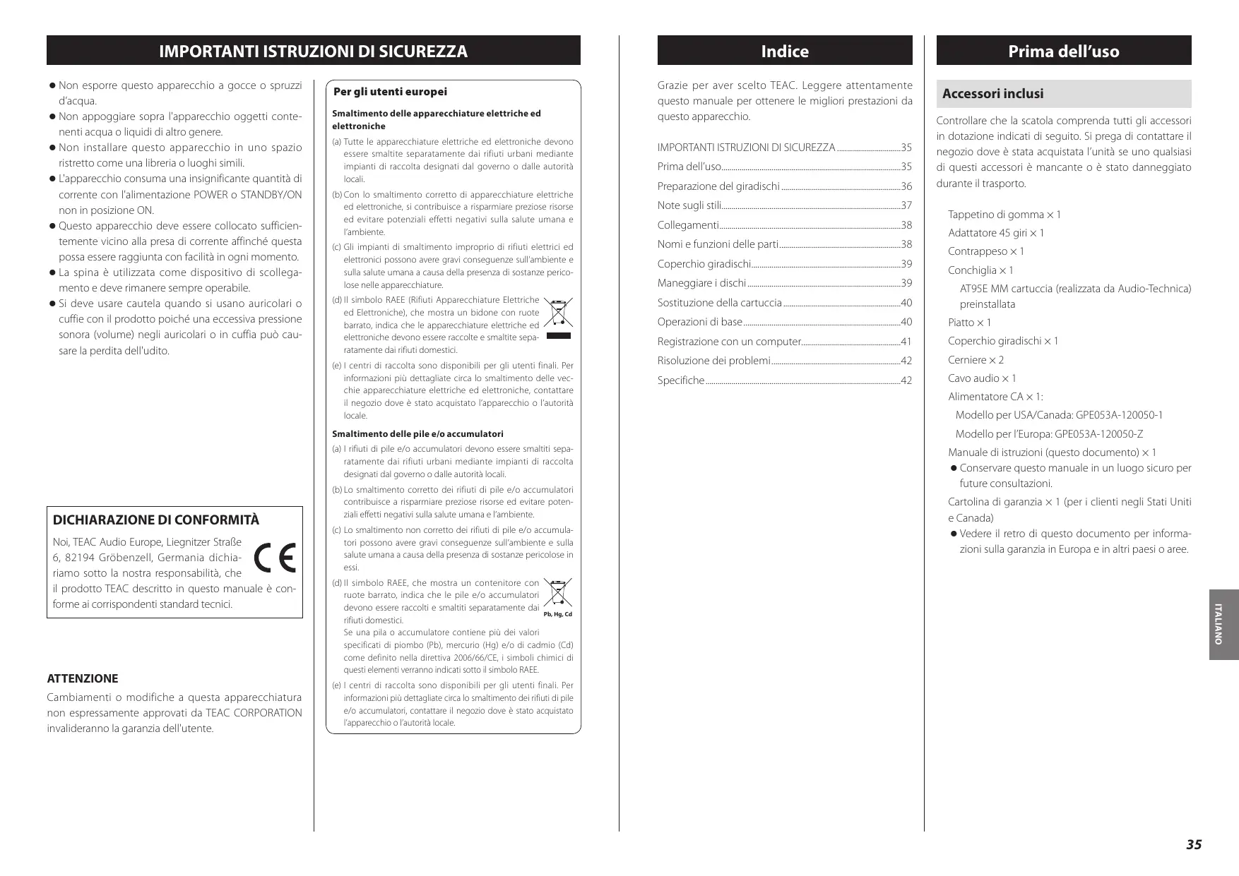 Grazie per aver scelto TEAC. Leggere attentamente questo manuale per ottenere le migliori prestazioni da questo apparecchio.