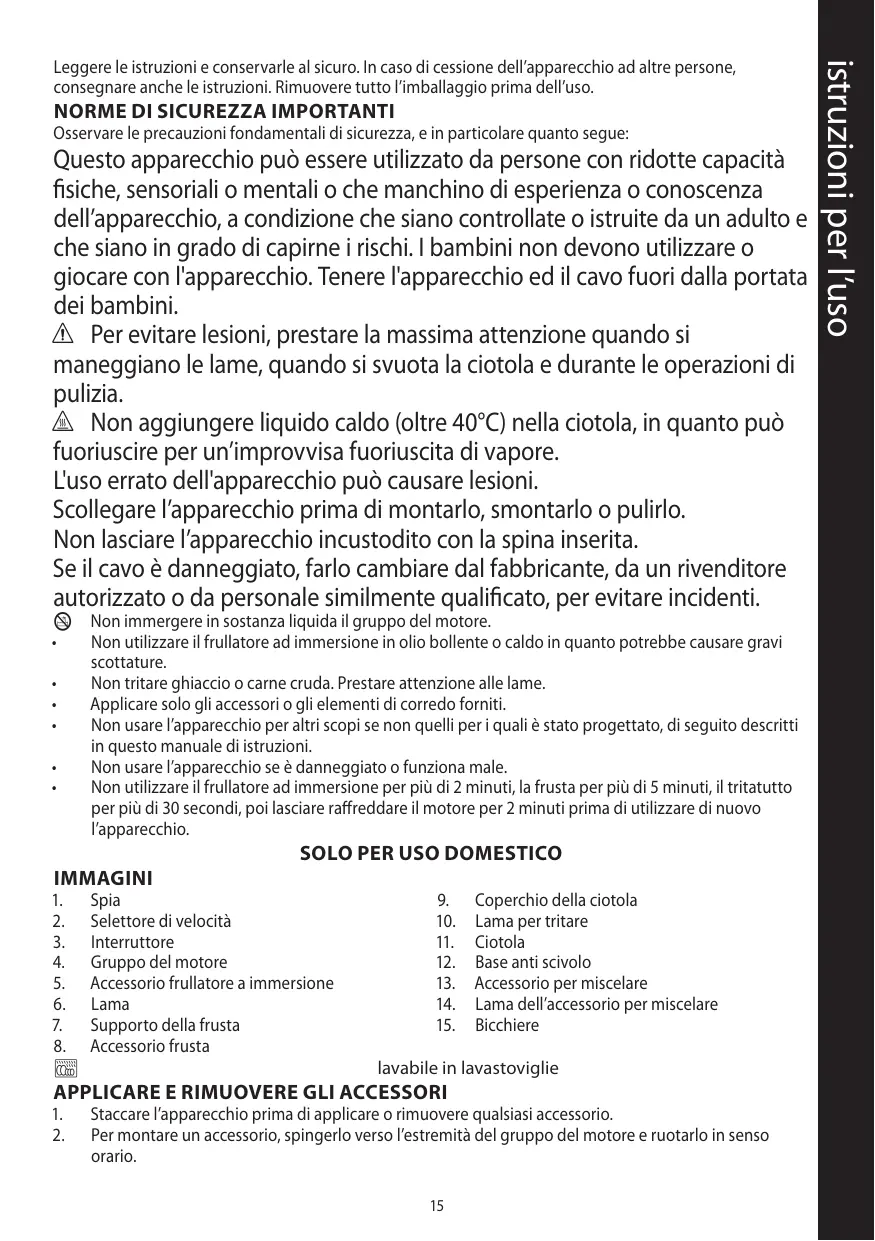 • Déposez le récipient contenant les aliments sur une surface plate et stable et tenez-la à l'aide de votre main libre. • Utilisez le pilon à vitesse faible, avec des impulsions de 1 ou 2 secondes à la fois et avec une pause d'au moins 1 seconde entre deux impulsions. • Ne l'utilisez pas pendant plus d'une minute.