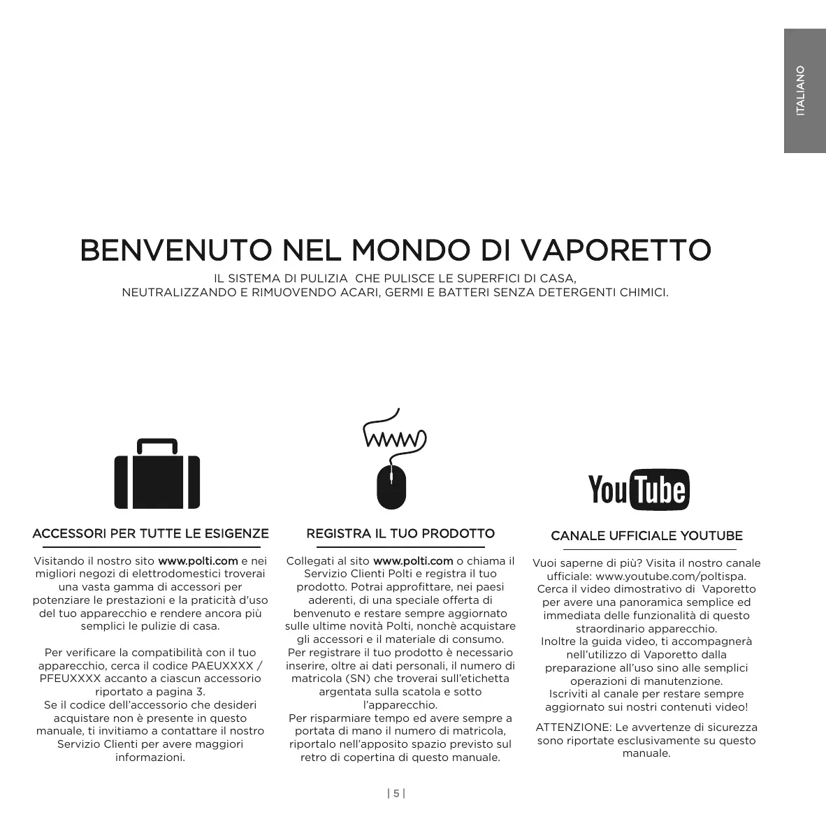Visitando il nostro sito www.polti.com e nei migliori negozi di elettrodomestici troverai una vasta gamma di accessori per potenziare le prestazioni e la praticità d'uso del tuo apparecchio e rendere ancora più semplici le pulizie di casa. Collegati al sito www.polti.com o chiama il Servizio Clienti Polti e registra il tuo prodotto. Potrai approfittare, nei paesi aderenti, di una speciale offerta di benvenuto e restare sempre aggiornato sulle ultime novità Polti, nonchè acquistare gli accessori e il materiale di consumo. Per registrare il tuo prodotto è necessario inserire, oltre ai dati personali, il numero di matricola (SN) che troverai sull’etichetta argentata sulla scatola e sotto l’apparecchio. Per risparmiare tempo ed avere sempre a portata di mano il numero di matricola, riportalo nell’apposito spazio previsto sul retro di copertina di questo manuale. Vuoi saperne di più? Visita il nostro canale ufficiale: www.youtube.com/poltispa. Cerca il video dimostrativo di Vaporetto per avere una panoramica semplice ed immediata delle funzionalità di questo straordinario apparecchio. Inoltre la guida video, ti accompagnerà nell’utilizzo di Vaporetto dalla preparazione all’uso sino alle semplici operazioni di manutenzione. Iscriviti al canale per restare sempre aggiornato sui nostri contenuti video! Per verificare la compatibilità con il tuo apparecchio, cerca il codice PAEUXXXX / PFEUXXXX accanto a ciascun accessorio riportato a pagina 3. Se il codice dell’accessorio che desideri acquistare non è presente in questo manuale, ti invitiamo a contattare il nostro Servizio Clienti per avere maggiori informazioni. |5| ATTENZIONE: Le avvertenze di sicurezza sono riportate esclusivamente su questo manuale. ITALIANO