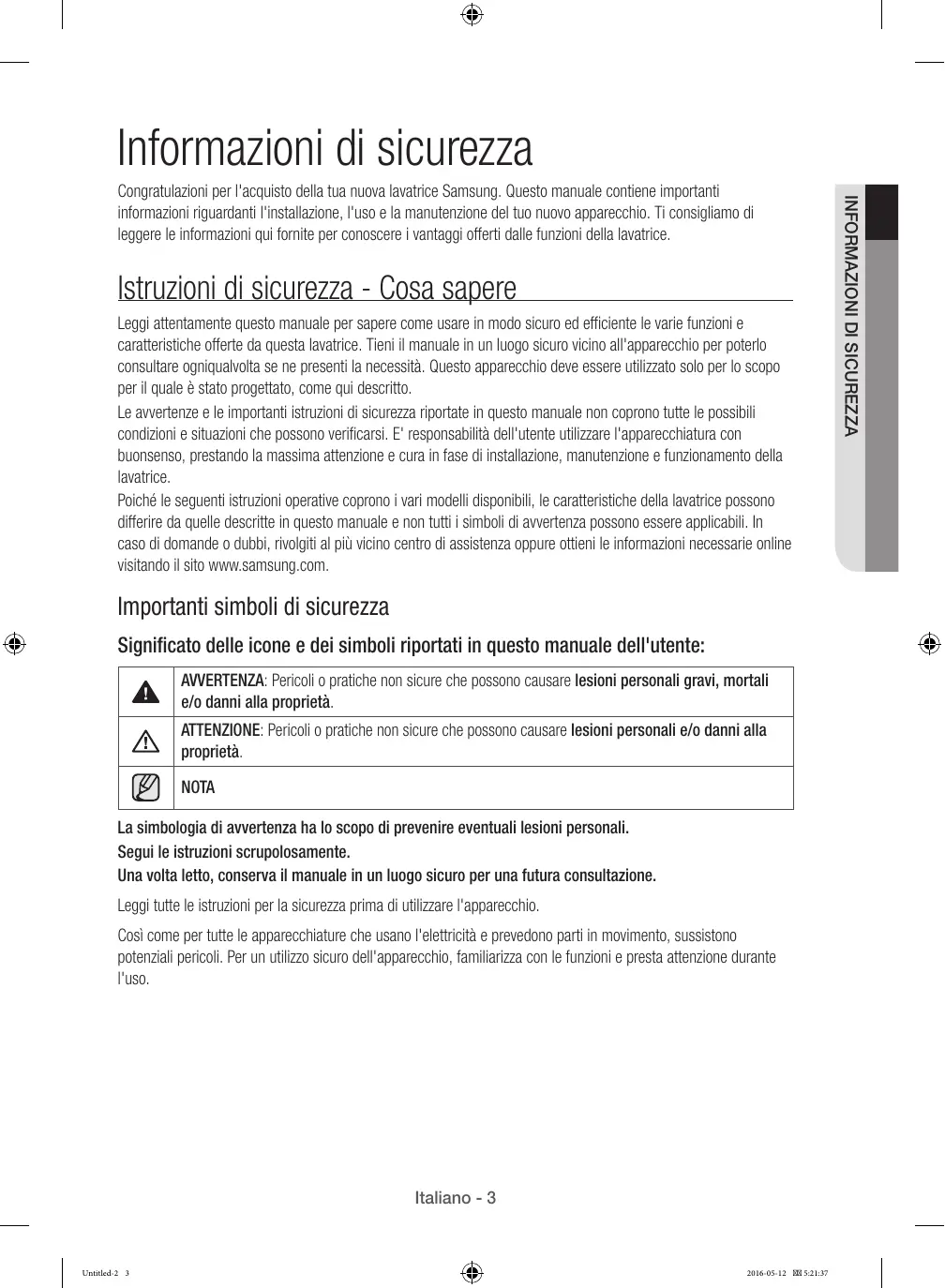 INFORMAZIONI DI SICUREZZA Congratulazioni per l'acquisto della tua nuova lavatrice Samsung. Questo manuale contiene importanti informazioni riguardanti l'installazione, l'uso e la manutenzione del tuo nuovo apparecchio. Ti consigliamo di leggere le informazioni qui fornite per conoscere i vantaggi offerti dalle funzioni della lavatrice.