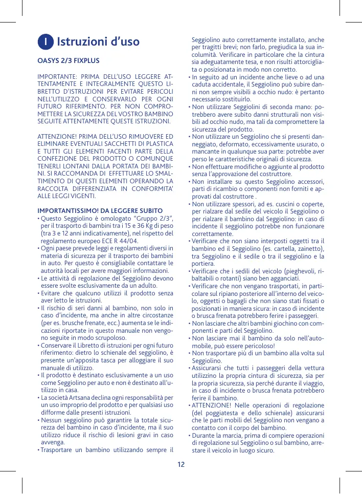 LIRE ATTENTIVEMENT ET ENTIÈREMENT CETTE NOTICE POUR ÉVITER TOUT DANGER ET LA CONSERVER POUR TOUTE RÉFÉRENCE FUTURE. POUR NE PAS COMPROMETTRE LA SÉCURITÉ DE VOTRE ENFANT, SUIVEZ ATTENTIVEMENT CES INSTRUCTIONS. ATTENTION ! AVANT D’UTILISER LE PRODUIT, ÔTER ET ÉLIMINER TOUS LES SACHETS EN PLASTIQUE ÉVENTUELS ET TOUS LES ÉLÉMENTS COMPOSANT L’EMBALLAGE DU PRODUIT ET LES TENIR HORS DE PORTÉE DES ENFANTS. IL EST CONSEILLÉ D’ÉLIMINER CES ÉLÉMENTS EN FAISANT LE TRI SÉLECTIF CONFORMÉMENT AUX LOIS EN VIGUEUR. TRÈS IMPORTANT ! À LIRE IMMÉDIATEMENT • Ce siège-auto est homologué “Groupe 2/3”, pour le transport d’enfants de 15 à 36 Kg (de 3 à 12 ans de façon indicative), conformément au règlement européen ECE R 44/04. • Chaque pays applique des lois et des règlements différents en matière de sécurité pour le transport des enfants en voiture. C’est pourquoi il est conseillé de contacter les autorités locales pour obtenir davantage d’informations. • Les activités de réglage du siège-auto doivent être effectuées exclusivement par un adulte. • Éviter que quiconque utilise le produit sans avoir lu la notice. • Le risque de blessures de l’enfant, non seulement en cas d’accident mais aussi dans d’autres circonstances (par ex. freinages brusques, etc.) augmente si les indications de cette notice ne sont pas suivies scrupuleusement. • Conserver la Notice pour toute référence future : une poche permettant de ranger la notice se trouve derrière le dossier du siège auto. • Le produit doit être utilisé exclusivement comme siège-auto et ne doit pas être utilisé à la maison. • La société Artsana décline toute responsabilité en cas d’utilisation incorrecte du produit et pour toute utilisation différente de cette notice. • Aucun siège-auto ne peut garantir la sécurité totale de l’enfant en cas d’accident, mais son utilisation réduit le risque de blessures graves. • Transporter un enfant dans un siège-auto correctement installé, même lors de trajets brefs ; dans le cas contraire, cela pourrait nuire à sa sécurité. Vérifier notamment que la ceinture est correcte-