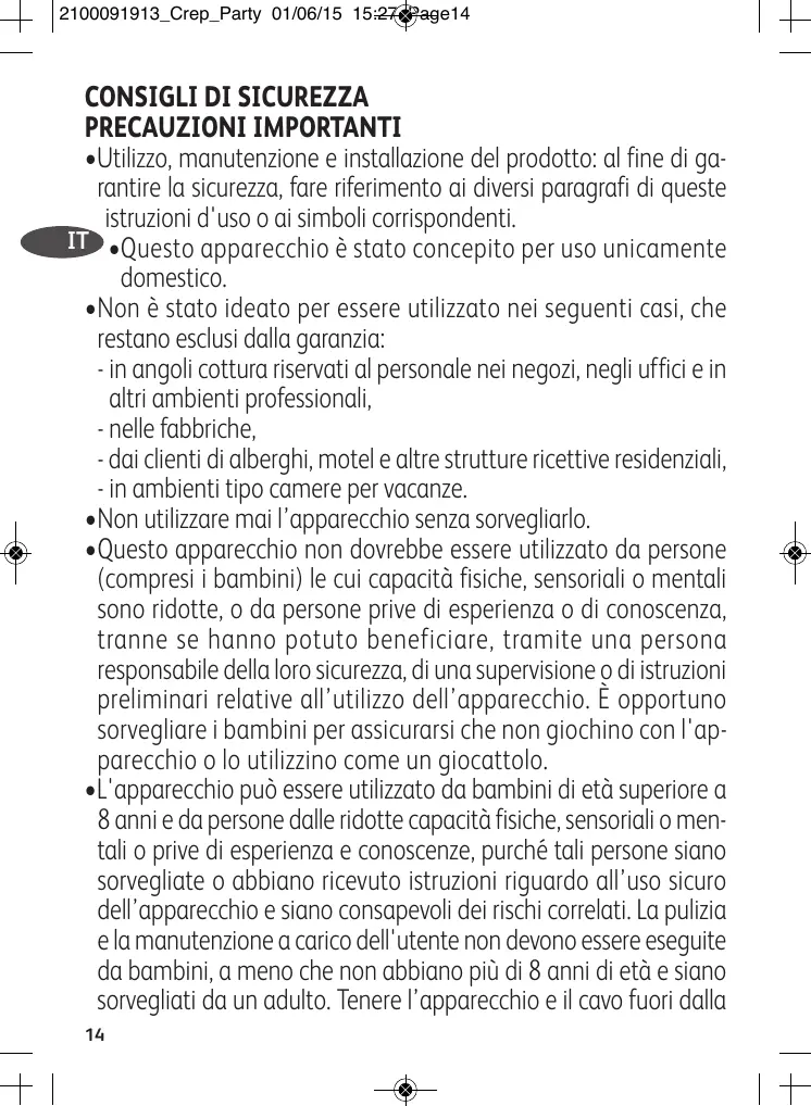 CONSIGLI DI SICUREZZA PRECAUZIONI IMPORTANTI •Utilizzo, manutenzione e installazione del prodotto: al fine di garantire la sicurezza, fare riferimento ai diversi paragrafi di queste istruzioni d'uso o ai simboli corrispondenti. IT •Questo apparecchio è stato concepito per uso unicamente domestico. •Non è stato ideato per essere utilizzato nei seguenti casi, che restano esclusi dalla garanzia: - in angoli cottura riservati al personale nei negozi, negli uffici e in altri ambienti professionali, - nelle fabbriche, - dai clienti di alberghi, motel e altre strutture ricettive residenziali, - in ambienti tipo camere per vacanze. •Non utilizzare mai l’apparecchio senza sorvegliarlo. •Questo apparecchio non dovrebbe essere utilizzato da persone (compresi i bambini) le cui capacità fisiche, sensoriali o mentali sono ridotte, o da persone prive di esperienza o di conoscenza, tranne se hanno potuto beneficiare, tramite una persona responsabile della loro sicurezza, di una supervisione o di istruzioni preliminari relative all’utilizzo dell’apparecchio. È opportuno sorvegliare i bambini per assicurarsi che non giochino con l'apparecchio o lo utilizzino come un giocattolo. •L'apparecchio può essere utilizzato da bambini di età superiore a 8 anni e da persone dalle ridotte capacità fisiche, sensoriali o mentali o prive di esperienza e conoscenze, purché tali persone siano sorvegliate o abbiano ricevuto istruzioni riguardo all’uso sicuro dell’apparecchio e siano consapevoli dei rischi correlati. La pulizia e la manutenzione a carico dell'utente non devono essere eseguite da bambini, a meno che non abbiano più di 8 anni di età e siano sorvegliati da un adulto. Tenere l’apparecchio e il cavo fuori dalla 14