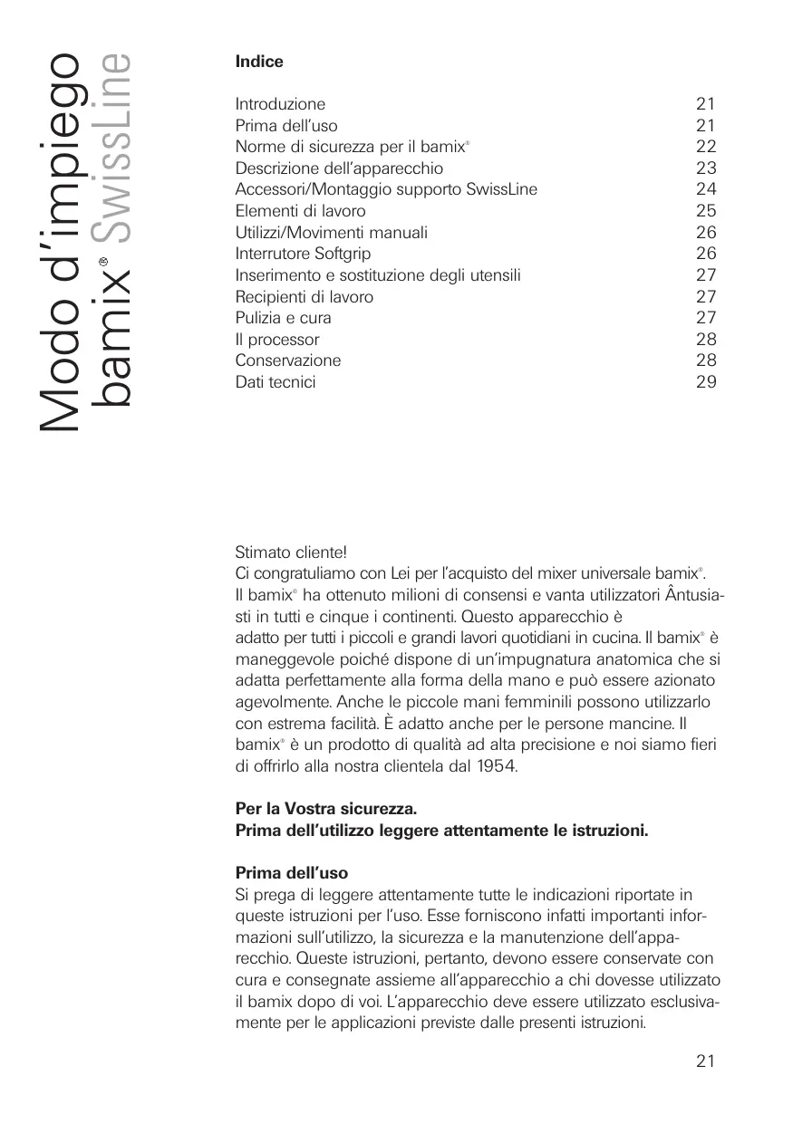 Stimato cliente! Ci congratuliamo con Lei per l’acquisto del mixer universale bamix . Il bamix ha ottenuto milioni di consensi e vanta utilizzatori Ântusiasti in tutti e cinque i continenti. Questo apparecchio è adatto per tutti i piccoli e grandi lavori quotidiani in cucina. Il bamix è maneggevole poiché dispone di un’impugnatura anatomica che si adatta perfettamente alla forma della mano e può essere azionato agevolmente. Anche le piccole mani femminili possono utilizzarlo con estrema facilità. È adatto anche per le persone mancine. Il bamix è un prodotto di qualità ad alta precisione e noi siamo fieri di offrirlo alla nostra clientela dal 1954.
