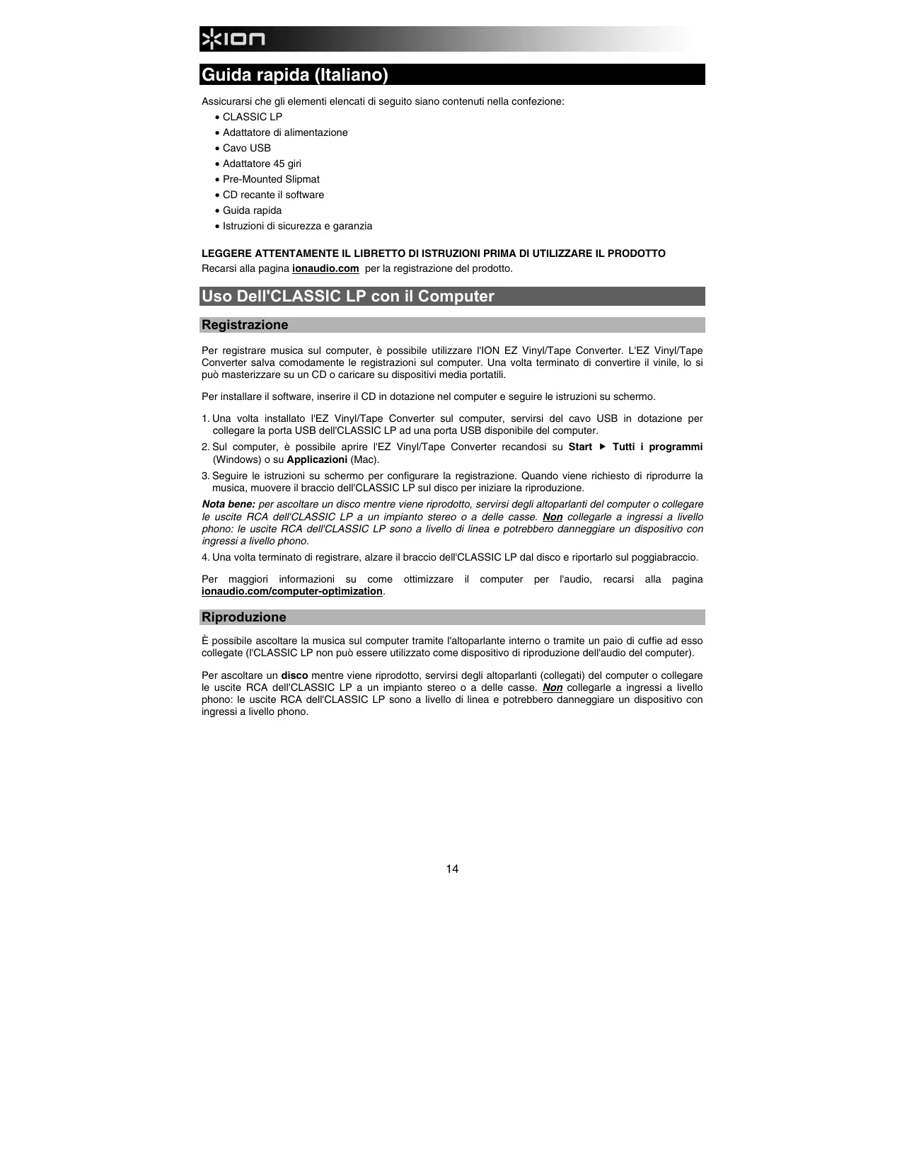 • Istruzioni di sicurezza e garanzia LEGGERE ATTENTAMENTE IL LIBRETTO DI ISTRUZIONI PRIMA DI UTILIZZARE IL PRODOTTO Recarsi alla pagina ionaudio.com per la registrazione del prodotto. Uso Dell'CLASSIC LP con il Computer Registrazione Per registrare musica sul computer, è possibile utilizzare l'ION EZ Vinyl/Tape Converter. L'EZ Vinyl/Tape Converter salva comodamente le registrazioni sul computer. Una volta terminato di convertire il vinile, lo si può masterizzare su un CD o caricare su dispositivi media portatili. Per installare il software, inserire il CD in dotazione nel computer e seguire le istruzioni su schermo.