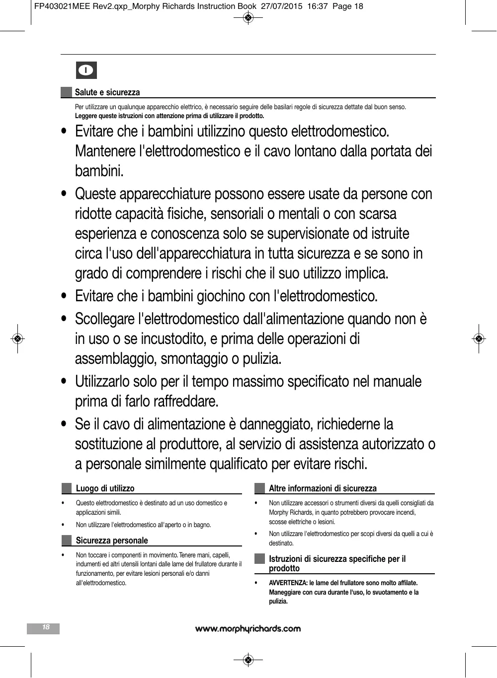Scarica le istruzioni per il tuo Elettrodomestico da cucina in formato PDF gratuitamente! Trova il tuo manuale M404002EE - MORPHY RICHARDS e riprendi in mano il tuo dispositivo elettronico. In questa pagina sono pubblicati tutti i documenti necessari per l'utilizzo del tuo dispositivo. M404002EE del marchio MORPHY RICHARDS.
