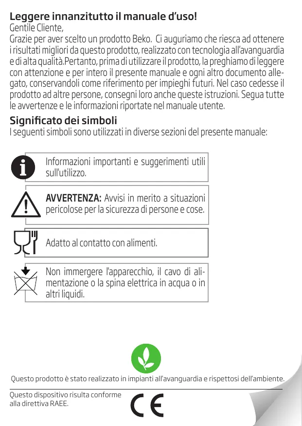 Użytkownikowi dodatkowo i nie wyłącza, nie ogranicza ani nie zawiesza uprawnień Użytkownika wynikających z przepisów o rękojmi za wady rzeczy sprzedanej na podstawie Kodeksu cywilnego. Leggere innanzitutto il manuale d’uso! Gentile Cliente, Grazie per aver scelto un prodotto Beko. Ci auguriamo che riesca ad ottenere i risultati migliori da questo prodotto, realizzato con tecnologia all’avanguardia e di alta qualità.Pertanto, prima di utilizzare il prodotto, la preghiamo di leggere con attenzione e per intero il presente manuale e ogni altro documento allegato, conservandoli come riferimento per impieghi futuri. Nel caso cedesse il prodotto ad altre persone, consegni loro anche queste istruzioni. Segua tutte le avvertenze e le informazioni riportate nel manuale utente. Significato dei simboli I seguenti simboli sono utilizzati in diverse sezioni del presente manuale: Informazioni importanti e suggerimenti utili sull'utilizzo. AVVERTENZA: Avvisi in merito a situazioni pericolose per la sicurezza di persone e cose. Adatto al contatto con alimenti. Non immergere l'apparecchio, il cavo di alimentazione o la spina elettrica in acqua o in altri liquidi. Questo prodotto è stato realizzato in impianti all’avanguardia e rispettosi dell’ambiente. Questo dispositivo risulta conforme alla direttiva RAEE.