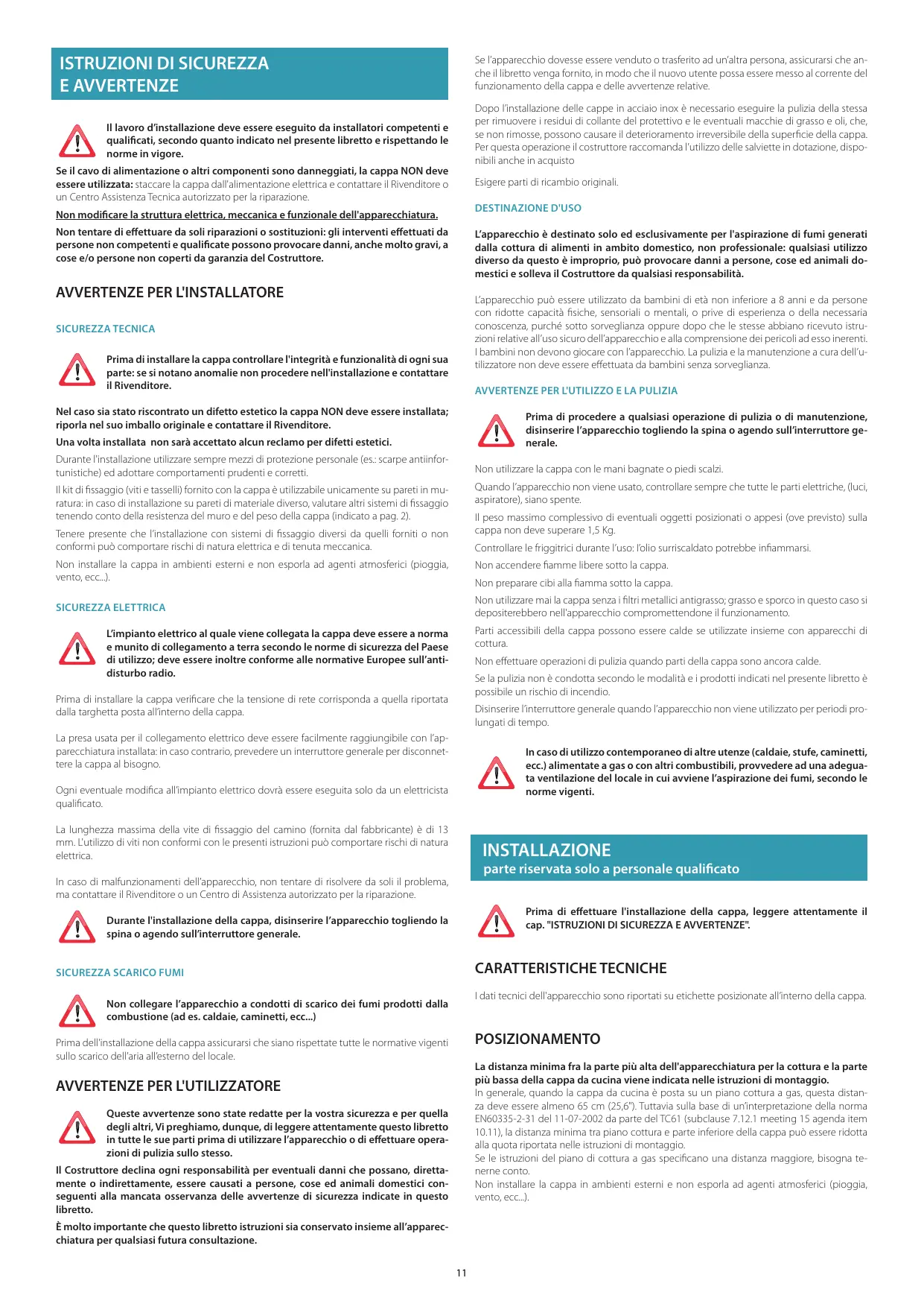 E AVVERTENZE Se l’apparecchio dovesse essere venduto o trasferito ad un’altra persona, assicurarsi che anche il libretto venga fornito, in modo che il nuovo utente possa essere messo al corrente del funzionamento della cappa e delle avvertenze relative. Dopo l’installazione delle cappe in acciaio inox è necessario eseguire la pulizia della stessa per rimuovere i residui di collante del protettivo e le eventuali macchie di grasso e oli, che, se non rimosse, possono causare il deterioramento irreversibile della supericie della cappa. Per questa operazione il costruttore raccomanda l’utilizzo delle salviette in dotazione, disponibili anche in acquisto Il lavoro d’installazione deve essere eseguito da installatori competenti e qualiicati, secondo quanto indicato nel presente libretto e rispettando le norme in vigore. Se il cavo di alimentazione o altri componenti sono danneggiati, la cappa NON deve essere utilizzata: staccare la cappa dall'alimentazione elettrica e contattare il Rivenditore o un Centro Assistenza Tecnica autorizzato per la riparazione. Esigere parti di ricambio originali. DESTINAZIONE D'USO Non modiicare la struttura elettrica, meccanica e funzionale dell'apparecchiatura. Non tentare di efettuare da soli riparazioni o sostituzioni: gli interventi efettuati da persone non competenti e qualiicate possono provocare danni, anche molto gravi, a cose e/o persone non coperti da garanzia del Costruttore. L’apparecchio è destinato solo ed esclusivamente per l'aspirazione di fumi generati dalla cottura di alimenti in ambito domestico, non professionale: qualsiasi utilizzo diverso da questo è improprio, può provocare danni a persone, cose ed animali domestici e solleva il Costruttore da qualsiasi responsabilità.