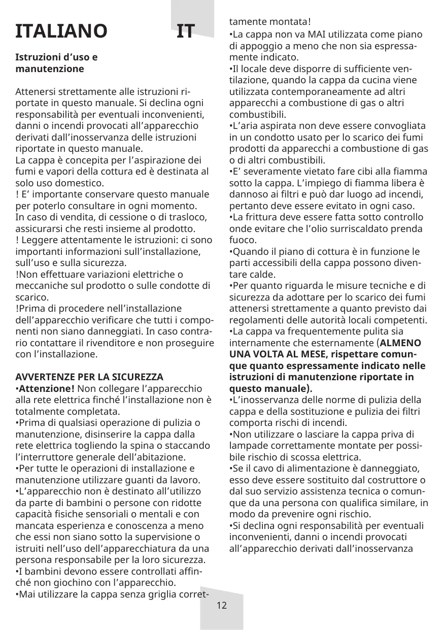 IT Istruzioni d’uso e manutenzione Attenersi strettamente alle istruzioni riportate in questo manuale. Si declina ogni responsabilità per eventuali inconvenienti, danni o incendi provocati all’apparecchio derivati dall’inosservanza delle istruzioni riportate in questo manuale. La cappa è concepita per l’aspirazione dei fumi e vapori della cottura ed è destinata al solo uso domestico. ! E’ importante conservare questo manuale per poterlo consultare in ogni momento. In caso di vendita, di cessione o di trasloco, assicurarsi che resti insieme al prodotto. ! Leggere attentamente le istruzioni: ci sono importanti informazioni sull’installazione, sull’uso e sulla sicurezza. !Non effettuare variazioni elettriche o meccaniche sul prodotto o sulle condotte di scarico. !Prima di procedere nell’installazione dell’apparecchio verificare che tutti i componenti non siano danneggiati. In caso contrario contattare il rivenditore e non proseguire con l’installazione. AVVERTENZE PER LA SICUREZZA •Attenzione! Non collegare l’apparecchio alla rete elettrica finché l’installazione non è totalmente completata. •Prima di qualsiasi operazione di pulizia o manutenzione, disinserire la cappa dalla rete elettrica togliendo la spina o staccando l’interruttore generale dell’abitazione. •Per tutte le operazioni di installazione e manutenzione utilizzare guanti da lavoro. •L’apparecchio non è destinato all’utilizzo da parte di bambini o persone con ridotte capacità fisiche sensoriali o mentali e con mancata esperienza e conoscenza a meno che essi non siano sotto la supervisione o istruiti nell’uso dell’apparecchiatura da una persona responsabile per la loro sicurezza. •I bambini devono essere controllati affinché non giochino con l’apparecchio. •Mai utilizzare la cappa senza griglia corret-