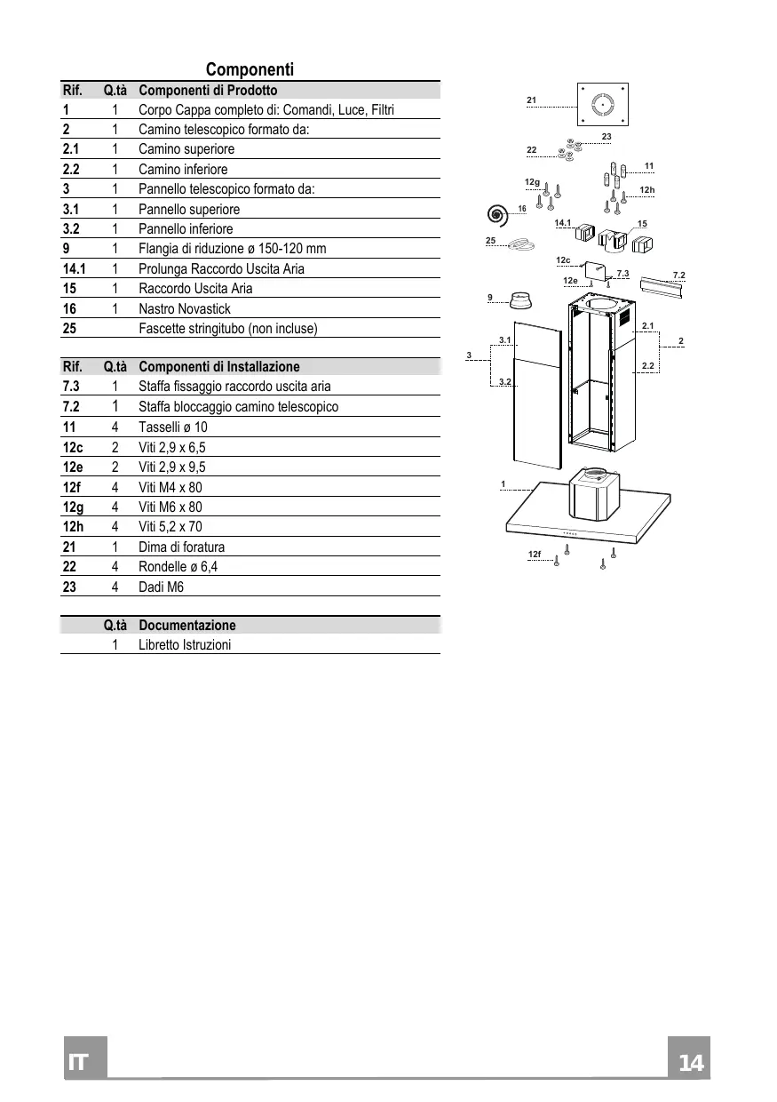 Componenti di Prodotto Corpo Cappa completo di: Comandi, Luce, Filtri Camino telescopico formato da: Camino superiore Camino inferiore Pannello telescopico formato da: Pannello superiore Pannello inferiore Flangia di riduzione ø 150-120 mm Prolunga Raccordo Uscita Aria Raccordo Uscita Aria Nastro Novastick Fascette stringitubo (non incluse)