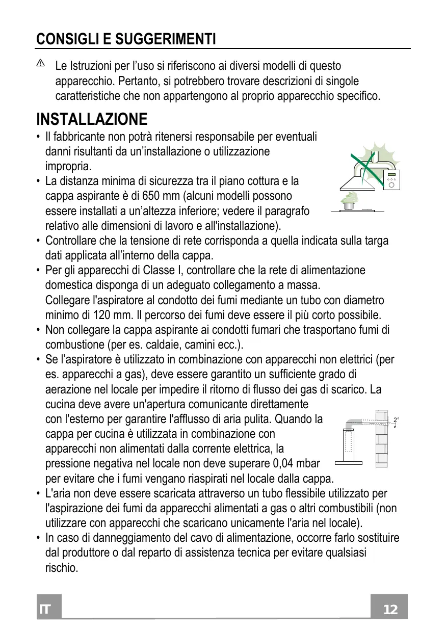 CONSIGLI E SUGGERIMENTI Le Istruzioni per l’uso si riferiscono ai diversi modelli di questo apparecchio. Pertanto, si potrebbero trovare descrizioni di singole caratteristiche che non appartengono al proprio apparecchio specifico. Assurez-vous que la tension de votre secteur correspond à celle indiquée sur la plaque des données appliquée à l’intérieur de la hotte. Pour les appareils de Classe I, s’assurer que l’installation électrique de votre intérieur dispose d’une mise à la terre adéquate. Relier l’aspirateur au conduit de cheminée avec un tube d’un diamètre minimum de 120 mm. Le parcours des fumées doit être le plus court possible. Ne pas relier la hotte aspirante aux conduits de cheminée qui 2° acheminent les fumées de combustion (par exemple de chaudières, de cheminées, etc.). Si vous utilisez l’aspirateur en combinaison avec des appareils non électriques (par ex. appareils à gaz), vous devez garantir un degré d’aération suffisant dans la pièce, afin d’empêcher le retour du flux des gaz de sortie. La cuisine doit présenter une ouverture communiquant directement vers l’extérieur pour garantir l’amenée d’air propre. Si vous utilisez la hotte de cuisine en combinaison avec des appareils non alimentés à l’électricité, la pression négative dans la pièce ne doit pas dépasser 0,04 mbar afin d’éviter que la hotte ne réaspire les fumées dans la pièce. Ne pas évacuer l’air à travers un tube flexible utilisé pour l’aspiration des fumées des appareils alimentés au gaz ou avec d’autres combustibles (ne pas utiliser avec des appareils ayant une seule sortie d’air dans la pièce). Si le cordon d’alimentation est endommagé, veuillez le faire remplacer par le fabricant ou par un service après-vente agréé pour éviter tout risque d’accident.
