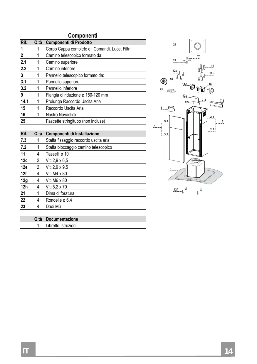 Componenti di Prodotto Corpo Cappa completo di: Comandi, Luce, Filtri Camino telescopico formato da: Camino superiore Camino inferiore Pannello telescopico formato da: Pannello superiore Pannello inferiore Flangia di riduzione ø 150-120 mm Prolunga Raccordo Uscita Aria Raccordo Uscita Aria Nastro Novastick Fascette stringitubo (non incluse)