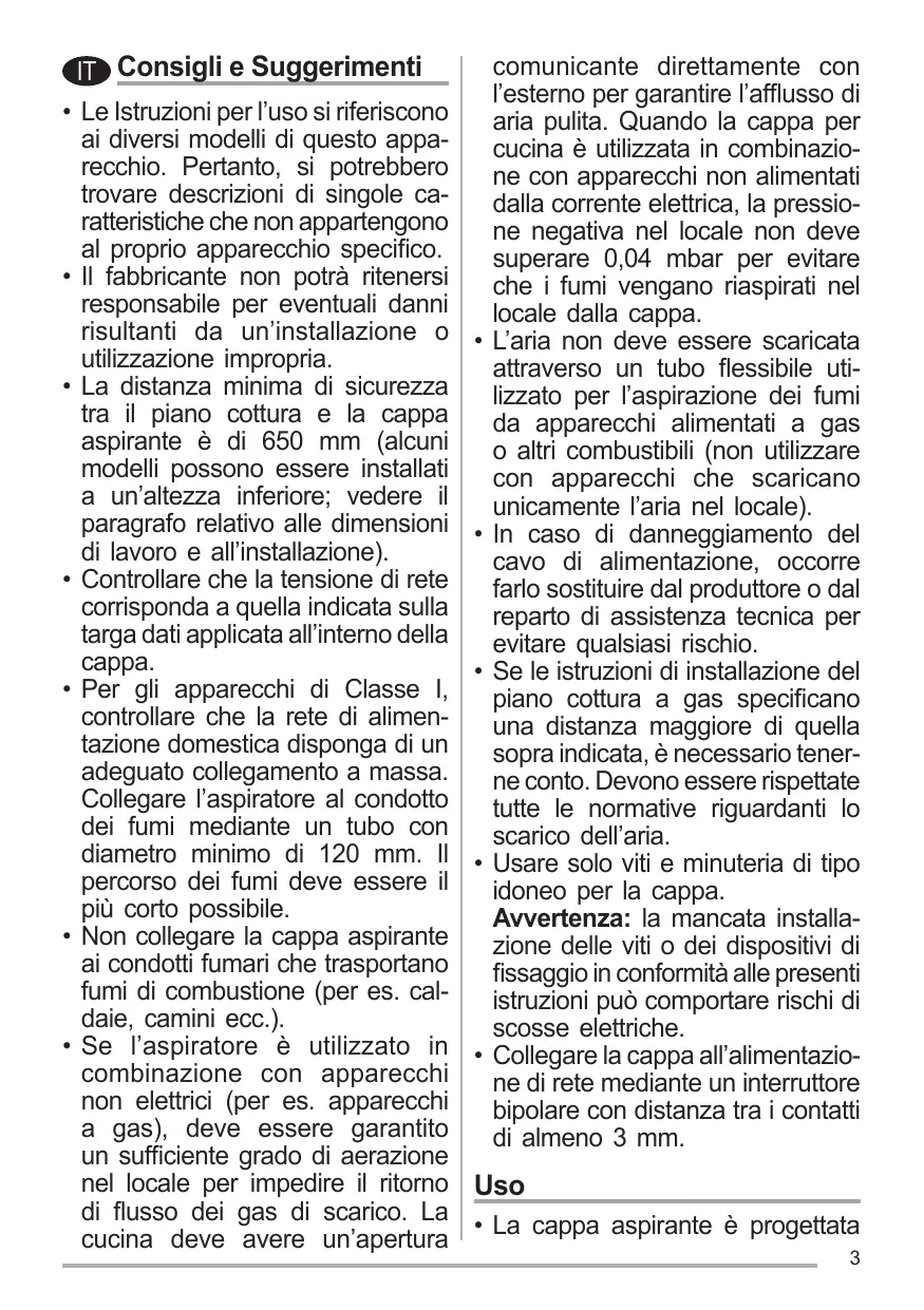 • Brancher la hotte à l’alimentation de secteur avec un interrupteur bipolaire ayant une ouverture des contacts d’au moins 3 mm.