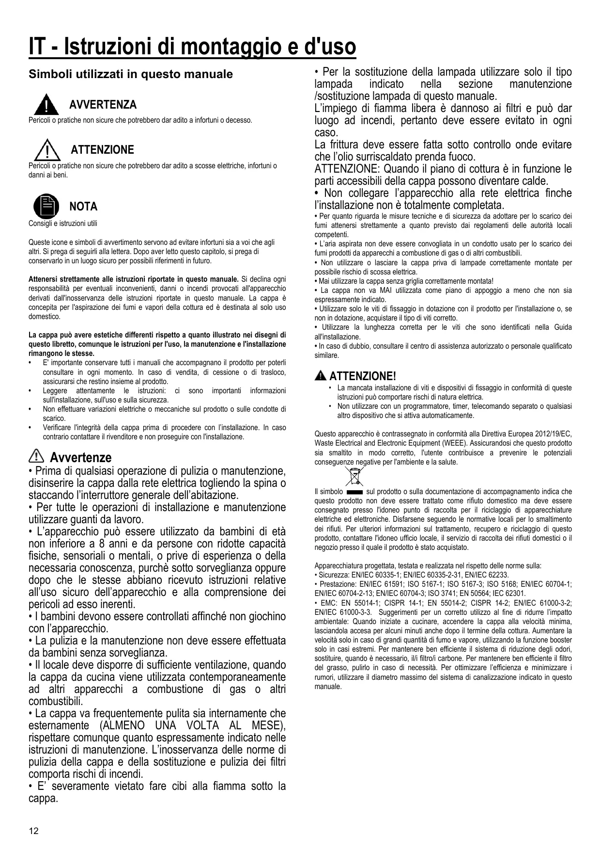 sul prodotto o sulla documentazione di accompagnamento indica che Il simbolo questo prodotto non deve essere trattato come rifiuto domestico ma deve essere consegnato presso l'idoneo punto di raccolta per il riciclaggio di apparecchiature elettriche ed elettroniche. Disfarsene seguendo le normative locali per lo smaltimento dei rifiuti. Per ulteriori informazioni sul trattamento, recupero e riciclaggio di questo prodotto, contattare l'idoneo ufficio locale, il servizio di raccolta dei rifiuti domestici o il negozio presso il quale il prodotto è stato acquistato. Apparecchiatura progettata, testata e realizzata nel rispetto delle norme sulla: • Sicurezza: EN/IEC 60335-1; EN/IEC 60335-2-31, EN/IEC 62233. • Prestazione: EN/IEC 61591; ISO 5167-1; ISO 5167-3; ISO 5168; EN/IEC 60704-1; EN/IEC 60704-2-13; EN/IEC 60704-3; ISO 3741; EN 50564; IEC 62301. • EMC: EN 55014-1; CISPR 14-1; EN 55014-2; CISPR 14-2; EN/IEC 61000-3-2; EN/IEC 61000-3-3. Suggerimenti per un corretto utilizzo al fine di ridurre l’impatto ambientale: Quando iniziate a cucinare, accendere la cappa alla velocità minima, lasciandola accesa per alcuni minuti anche dopo il termine della cottura. Aumentare la velocità solo in caso di grandi quantità di fumo e vapore, utilizzando la funzione booster solo in casi estremi. Per mantenere ben efficiente il sistema di riduzione degli odori, sostituire, quando è necessario, il/i filtro/i carbone. Per mantenere ben efficiente il filtro del grasso, pulirlo in caso di necessità. Per ottimizzare l’efficienza e minimizzare i rumori, utilizzare il diametro massimo del sistema di canalizzazione indicato in questo manuale.