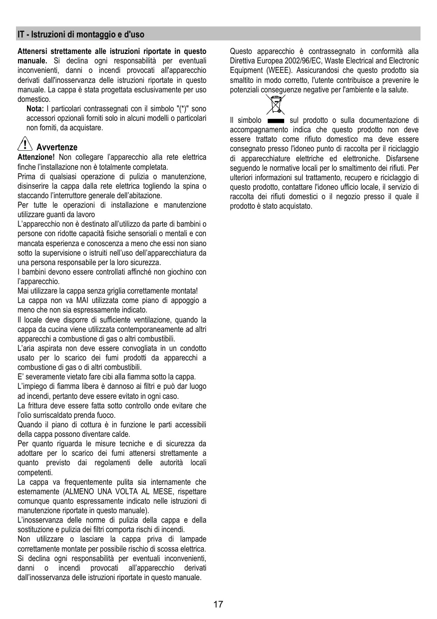 Attention! Ne pas raccorder l’appareil au circuit électrique avant que le montage ne soit complètement terminé. Avant toute opération de nettoyage ou d’entretien, débrancher la hotte du circuit électrique en retirant la prise ou en coupant l’interrupteur général de l’habitation. Munissez-vous de gants de travail avant d’effectuer toute opération d’installation et d’entretien. L’appareil n’est pas destiné à une utilisation par des enfants ou des personnes à capacités physiques, sensorielles ou mentales réduites et sans expérience et connaissance à moins qu’ils ne soient sous la supervision ou formés sur l’utilisation de l’appareil par une personne responsable de leur sécurité. Les enfants doivent être surveillés afin qu’ils ne jouent pas avec l’appareil. Ne jamais utiliser la hotte sans que la grille ne soit montée correctement! La hotte ne doit JAMAIS être utilisée comme plan pour déposer quelque chose sauf si cela est expressément indiqué. Quand la hotte est utilisée en même temps que d’autres appareils à combustion de gaz ou d’autres combustibles, le local doit disposer d’une ventilation suffisante. L’air aspiré ne doit jamais être envoyé dans un conduit utilisé pour l’évacuation des fumées produites par des appareils à combustion de gaz ou d’autres combustibles. Il est formellement interdit de faire flamber les aliments sous la hotte. L’utilisation de flammes libres peut entraîner des dégâts aux filtres et peut donner lieu à des incendies, il faut donc les éviter à tout prix. La friture d’aliments doit être réalisée sous contrôle pour éviter que l’huile surchauffée ne prenne feu. Les pièces accessibles peuvent se réchauffer de façon importante quand elles sont utilisées avec des appareils pour la cuisson. En ce qui concerne les mesures techniques et de sécurité à adopter pour l’évacuation des fumées, s’en tenir strictement à ce qui est prévu dans les règlements des autorités locales compétentes. La hotte doit être régulièrement nettoyée, aussi bien à l’intérieur qu’à l’extérieur (AU MOINS UNE FOIS PAR MOIS, respecter néanmoins les instructions relatives à l’entretien fournies dans ce manuel).