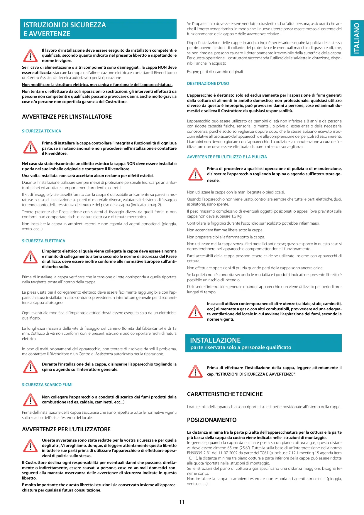 CARATTERISTICHE TECNICHE In caso di utilizzo contemporaneo di altre utenze (caldaie, stufe, caminetti cc.) alimentate a gas o con altri combustibili provvedere ad una adegu ta ventilazione del locale in cui avviene l'aspirazione d secondo le norme vigenti. Prima di effettuare l'installazione della cappa, leggere attentamente il cap. "ISTRUZIONI DI SICUREZZA E AVVERTENZE". 1 dati tecnici dell'apparecchio sono riportati su etichette posizionate allinterno della cappa POSIZIONAMENTO La distanza à fra la parte piü alta dell'apparecchiatura per la cottura e la parte più bassa della cappa da cucina viene indicata nelle istruzioni di montaggio. In generale, quando la cappa da cucina è posta su un piano cottura à gas, questa distan za deve essere almeno 65 cm (25,6). Tuttavia sulla base di uninterpretazione della norma EN60335-2-31 del 11-07-2002 da parte del TC61 (subclause 7.12.1 meeting 15 agenda item 10.11) la distanza minima tra piano cottura e parte inferiore della cappa pud essere ridotta alla quota riportata nelle istruzioni di montaggio. Se le istruzioni del piano di cottura a gas specificano una distanza maggiore, bisogna te nerne conto. Non installare la cappa in ambienti esterni e non esporla ad agenti atmosferici (pioggia, vento, ect.) ITALIANO