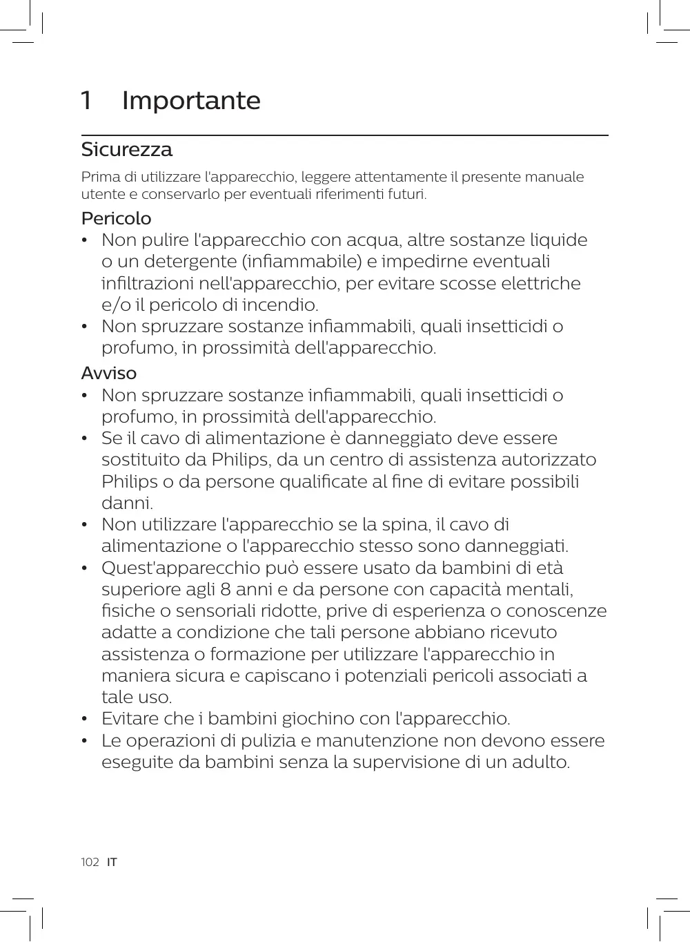 • Ne vous asseyez pas et ne montez pas sur l'appareil. Ne placez jamais d'objets au-dessus de l'appareil. • Ne placez pas l'appareil directement sous un climatiseur afin d'éviter que de la condensation s'écoule sur l'appareil. • Utilisez exclusivement les filtres Philips d'origine spécialement destinés à cet appareil. N'utilisez pas d'autres filtres. • La combustion du filtre peut causer des blessures irréversibles et/ou mettre des vies en péril. N'utilisez pas le filtre comme carburant ou à des fins similaires. • Évitez de heurter l'appareil (l'entrée et la sortie d'air en particulier) avec des objets durs. • N'insérez pas vos doigts ou des objets dans la sortie d'air ou l'entrée d'air afin d'éviter tout risque de blessure ou de dysfonctionnement de l'appareil. • N'utilisez pas l'appareil après avoir utilisé un insecticide ou à proximité de résidus huileux, d'encens se consumant ou de fumées chimiques. • N'utilisez pas l'appareil à proximité d'un appareil fonctionnant au gaz, d'une installation de chauffage ou d'une cheminée. • Débranchez l'appareil lorsque vous souhaitez le déplacer, remplacer le filtre ou effectuer une tâche d'entretien. • Cet appareil est uniquement destiné à un usage domestique dans des conditions de fonctionnement normales. 86