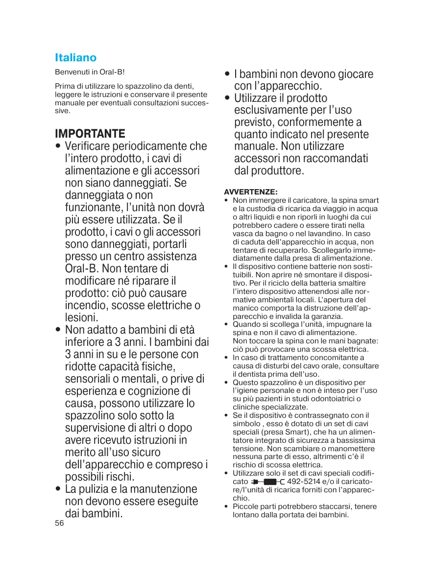 492-5214, l’appareil doit uniquement être utilisé avec un câble spécial Braun/Oral-B (Smart Plug) comportant la même référence. • De petites pièces peuvent se détacher, tenir hors de portée des enfants.