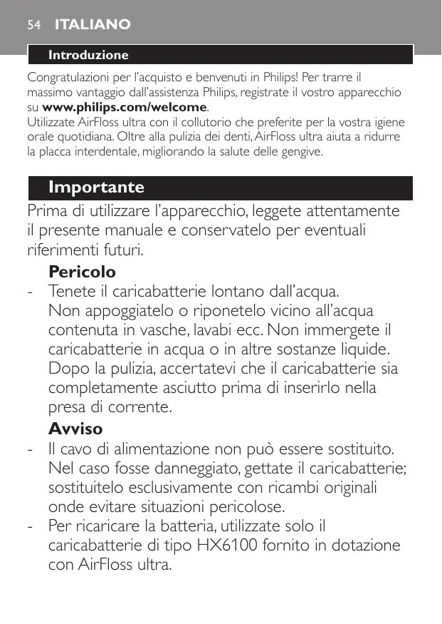 Importante Prima di utilizzare l’apparecchio, leggete attentamente il presente manuale e conservatelo per eventuali riferimenti futuri. Pericolo -- Tenete il caricabatterie lontano dall’acqua. Non appoggiatelo o riponetelo vicino all’acqua contenuta in vasche, lavabi ecc. Non immergete il caricabatterie in acqua o in altre sostanze liquide. Dopo la pulizia, accertatevi che il caricabatterie sia completamente asciutto prima di inserirlo nella presa di corrente. Avviso -- Il cavo di alimentazione non può essere sostituito. Nel caso fosse danneggiato, gettate il caricabatterie; sostituitelo esclusivamente con ricambi originali onde evitare situazioni pericolose. -- Per ricaricare la batteria, utilizzate solo il caricabatterie di tipo HX6100 fornito in dotazione con AirFloss ultra.